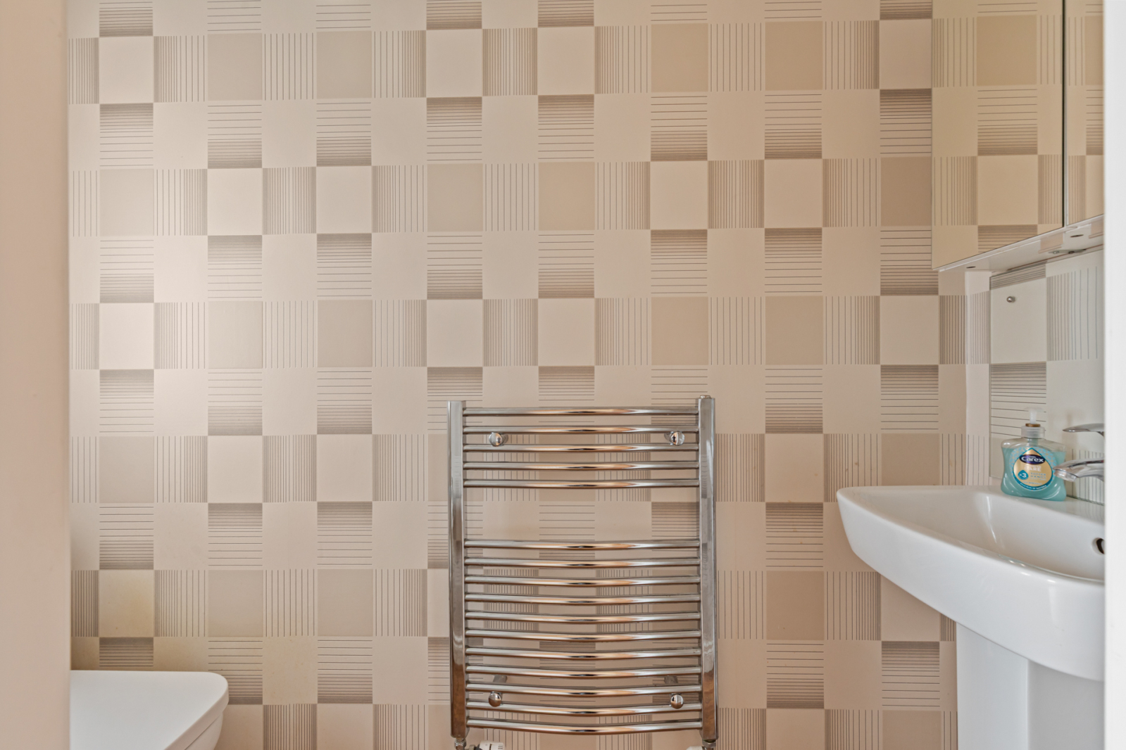 Low flush WC, pedestal wash hand basin with mixer taps, chrome towel radiator, wood laminate flooring. Airing cupboard with immersion copper cylinder.
