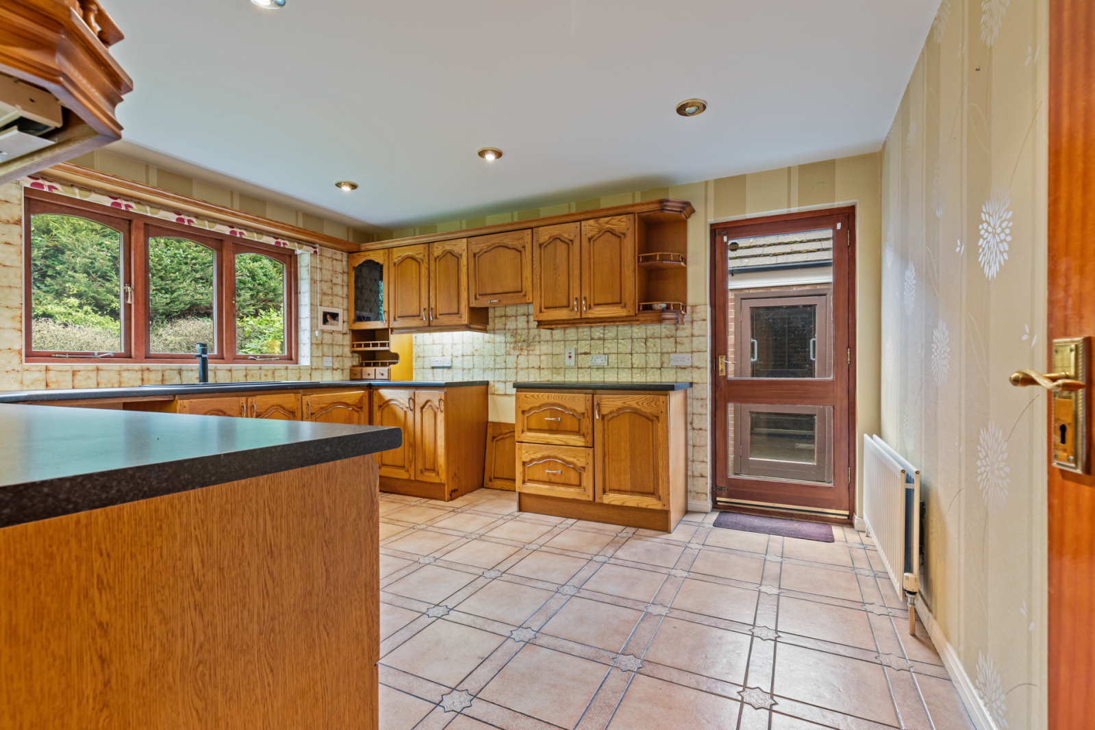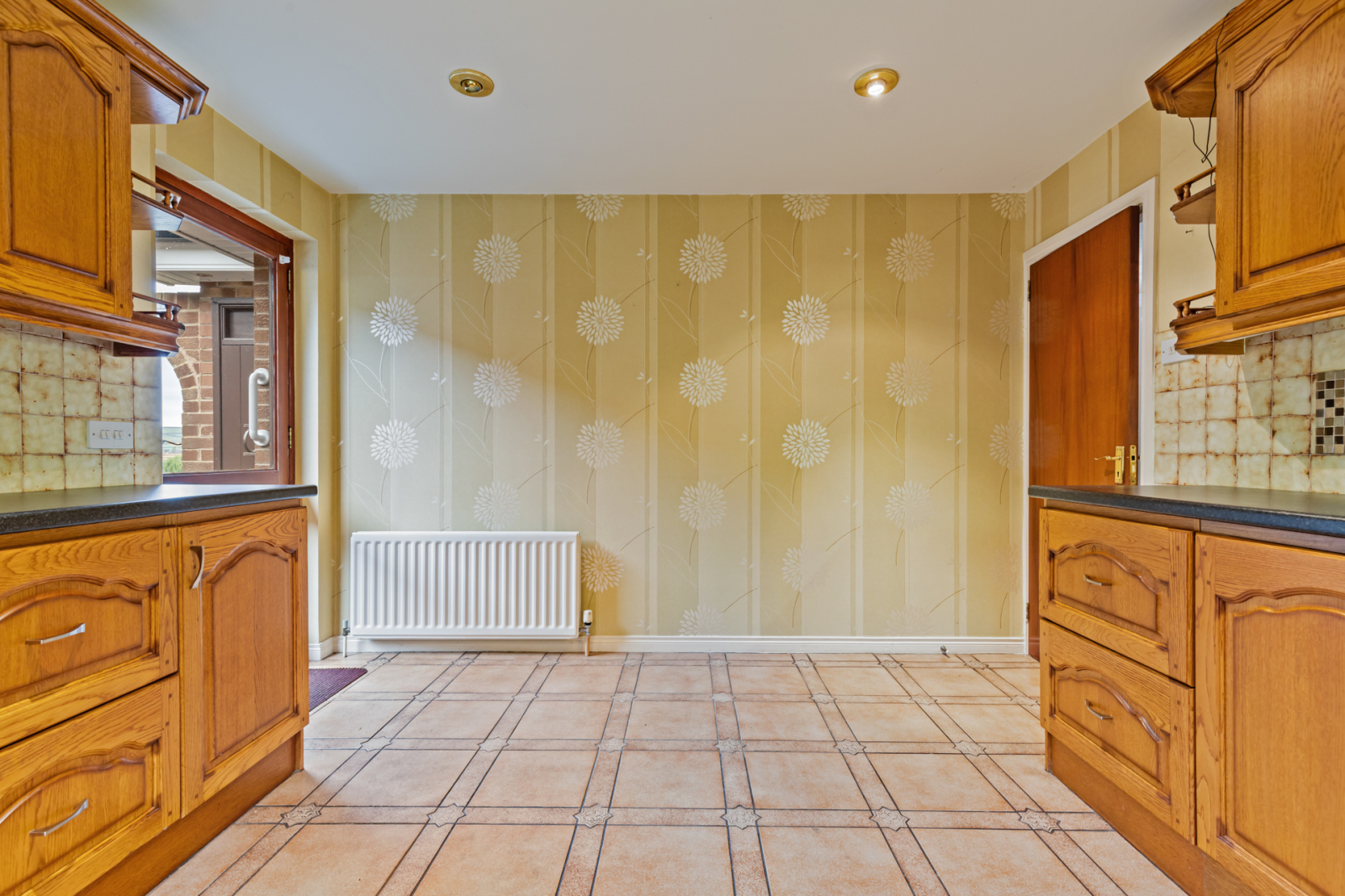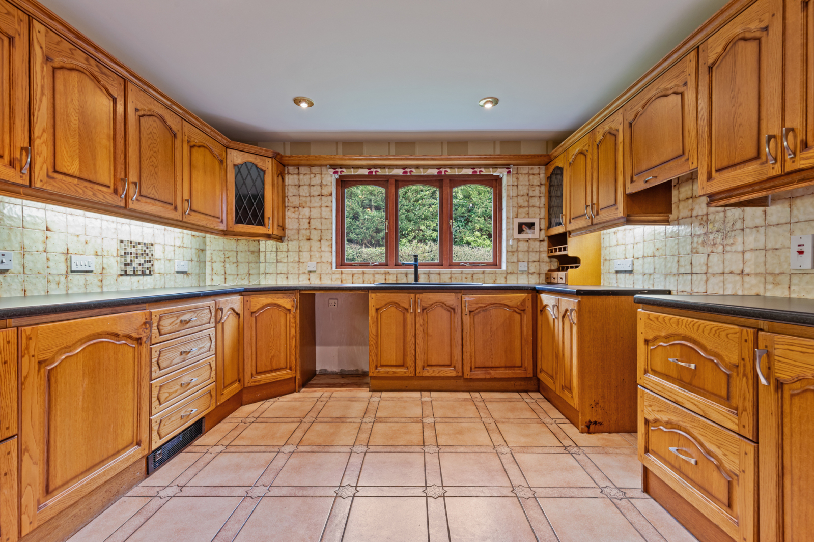 Full range of high and low level oak units, single drainer 1.5 tub sink unit with mixer taps, plumbed for dishwasher, recess for cooker, ceramic tiled floor.