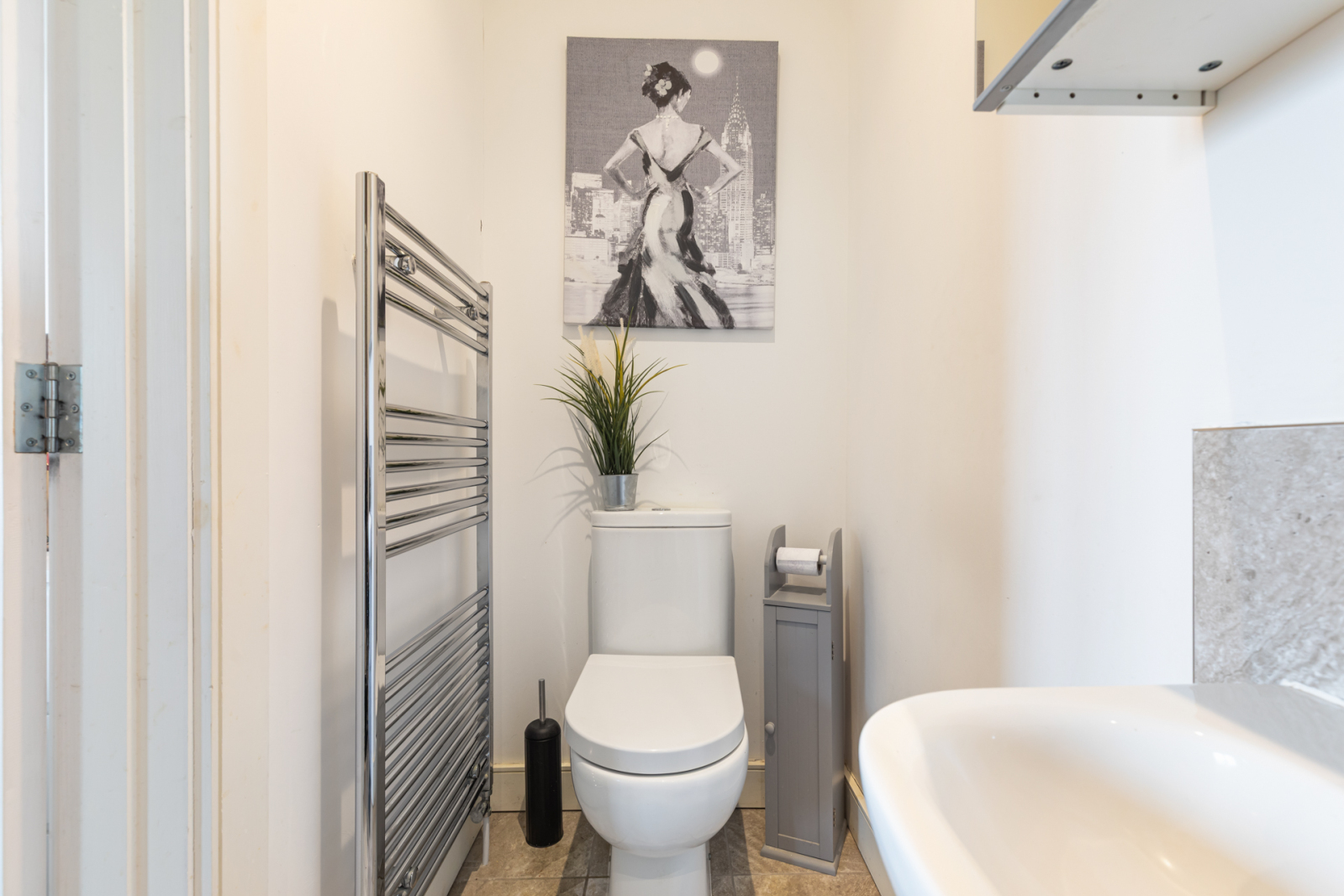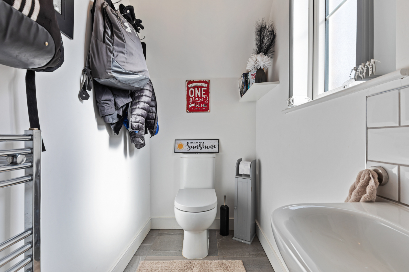 White suite comprising of low flush WC, wash hand basin with mixertap, tiled splashback, tiled flooring, vertical chrome heated towel rail, extractor fan.