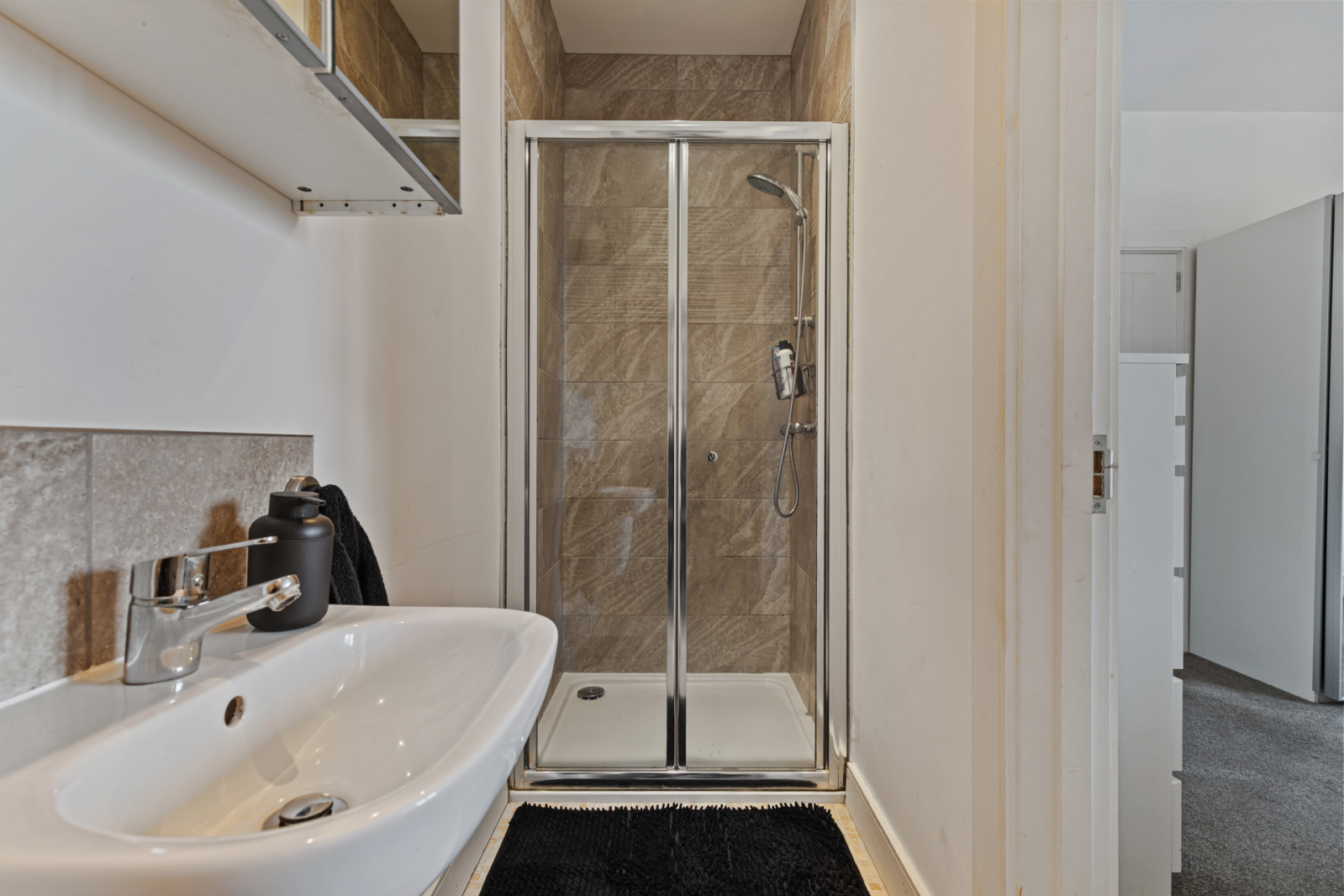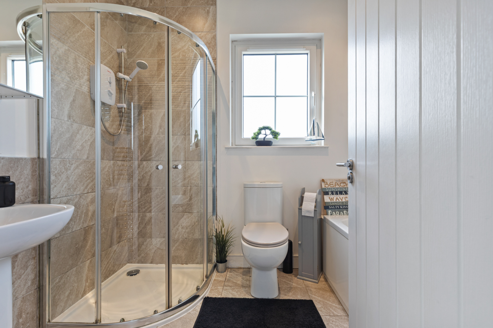 Whtie suite comprising of low flush WC, wash hand basin with mixer tap and tiled splashback, walk-in thermostatically controlled shower, partyl tiled walls, tiled flooring, recessed spotlighting, extractor fan, vertical chrome heated towel rail.