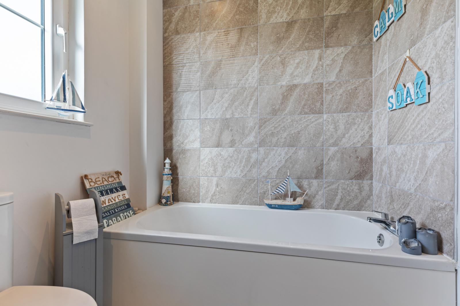 Whtie suite comprising of low flush WC, wash hand basin with mixer tap, panelled bath with hot and cold tap, walk-in electric shower unit, partly tiled walls, tiled flooring, recessed spotlighting, extractor fan, vertical chrome heated towel rail