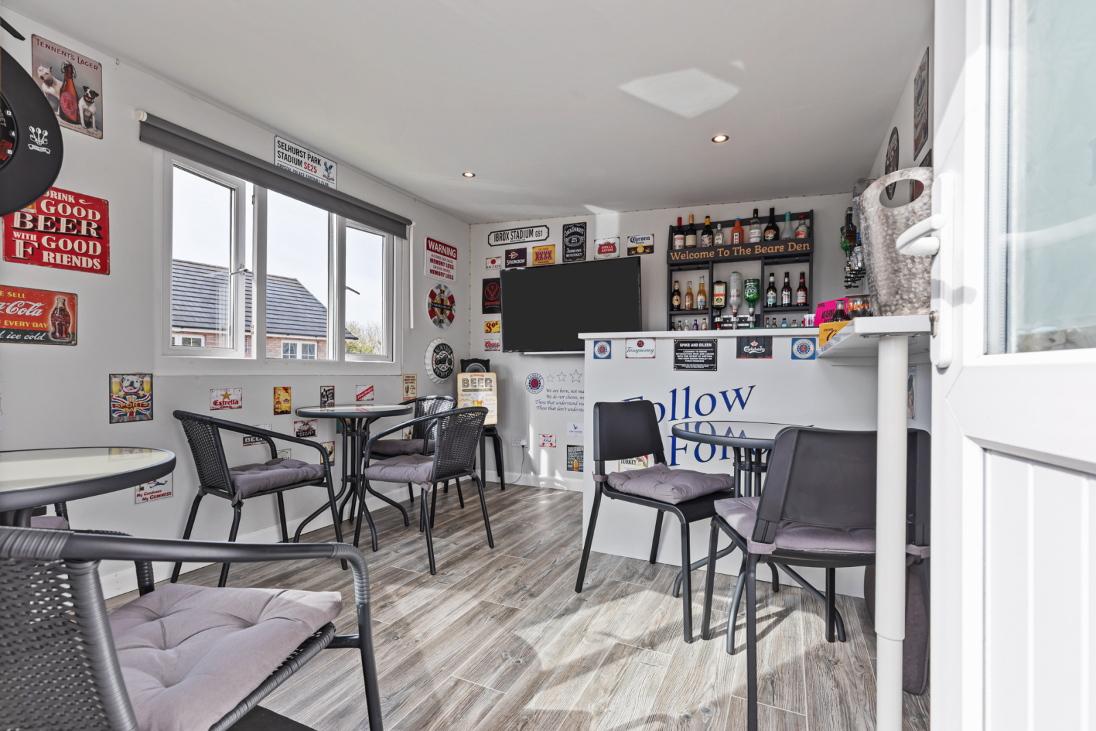 Externally to the front there is an ample driveway for off street car parking, garden laid in lawn. Tiered rear garden laid in artficial grass, paved patio, loose stone pebbled area, composite decking, PVC garden room / converted bar.