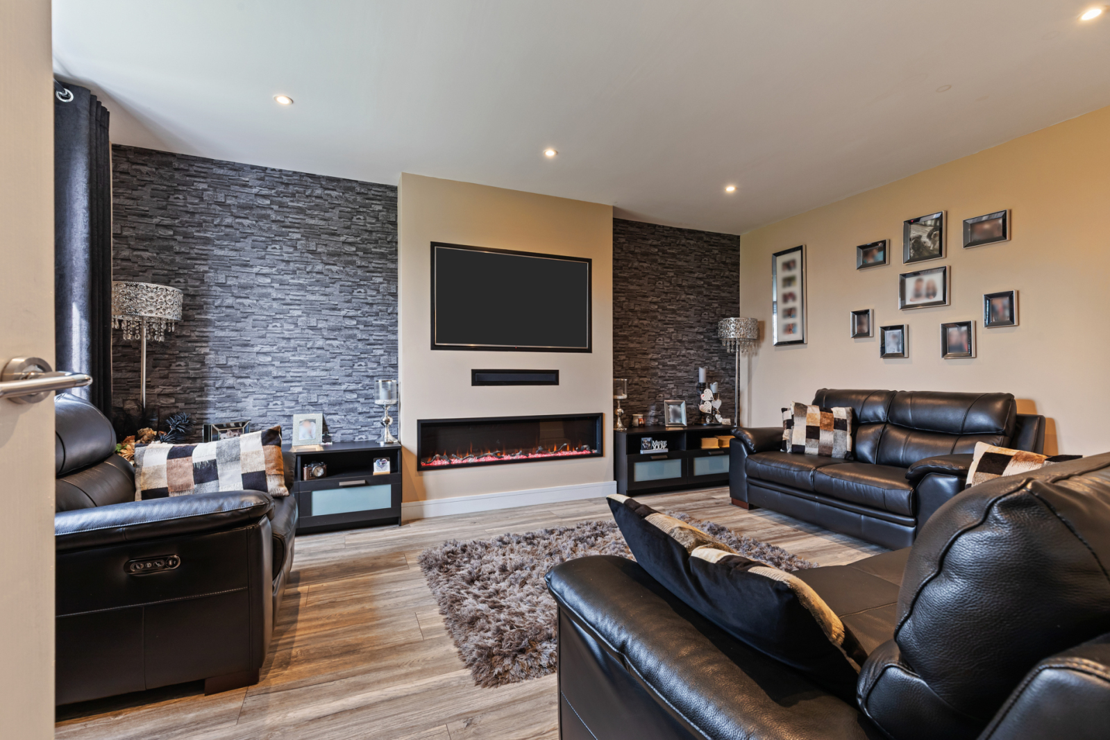 Outlook to front, feature fireplace, laminate wood effect flooring, recessed spotlighting.