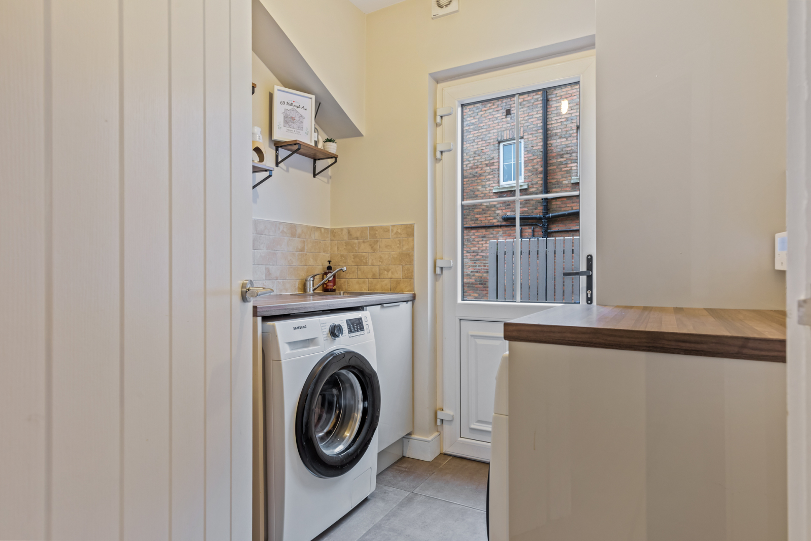 Range of high and low level units, laminate worksurface with stainless steel sink and drainer, 1 tub with hot and cold tap, plumbed for washing machine, space for tumble dryer, gas boiler, access door to side.