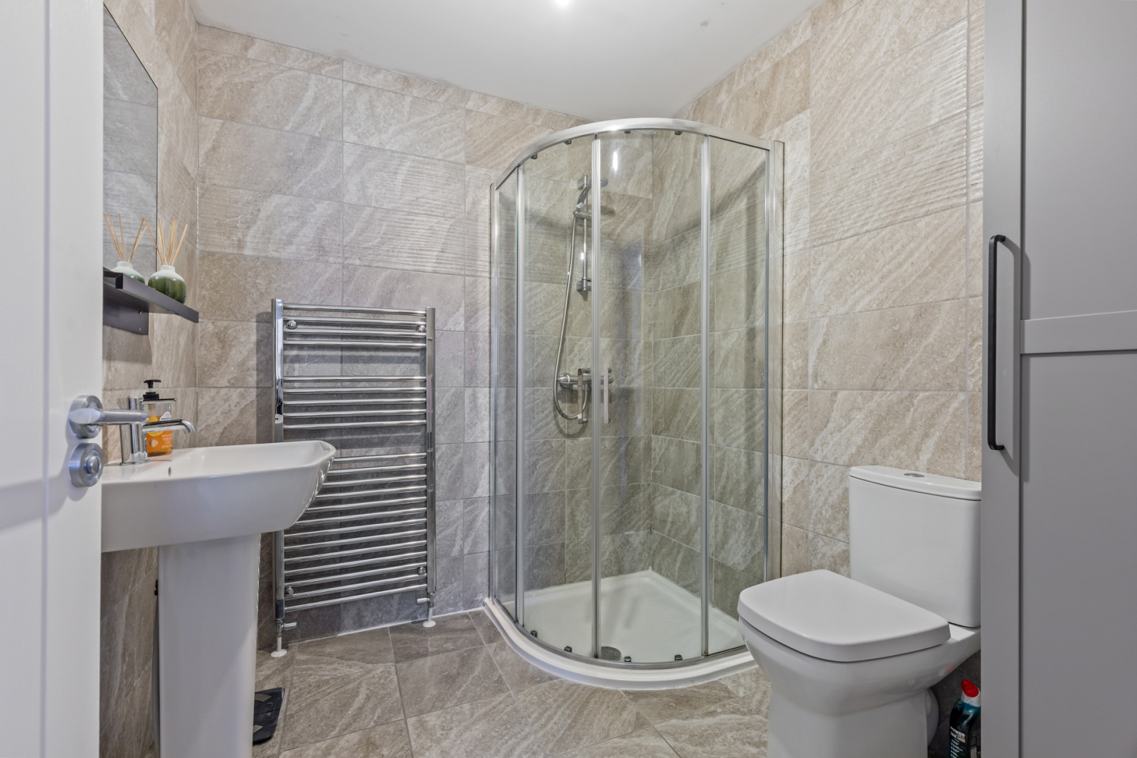 White suite comprising low flush WC, pedestal wash hand basin with mixer tap, walk-in thermostatically controlled shower, fully tiled walls, tiled flooring, extractor fan, vertical chrome heated towel rail.