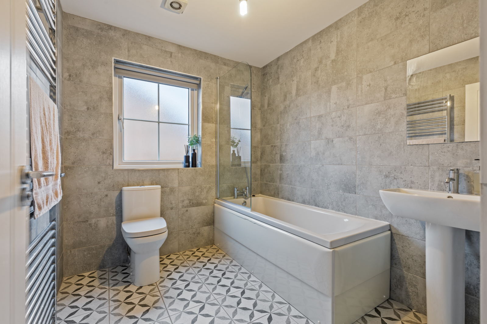 White suite comprising of low flush WC, pedestal wash hand basin with mixer tap, panelled bath with hot and cold tap and handset, tiled flooring, fully tiled walls, extractor fan, vertical chrome heated towel rail.