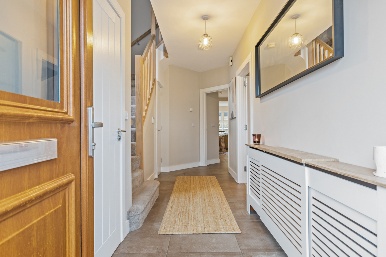 Tiled flooring, storage belwo stairs, access to downstairs WC.