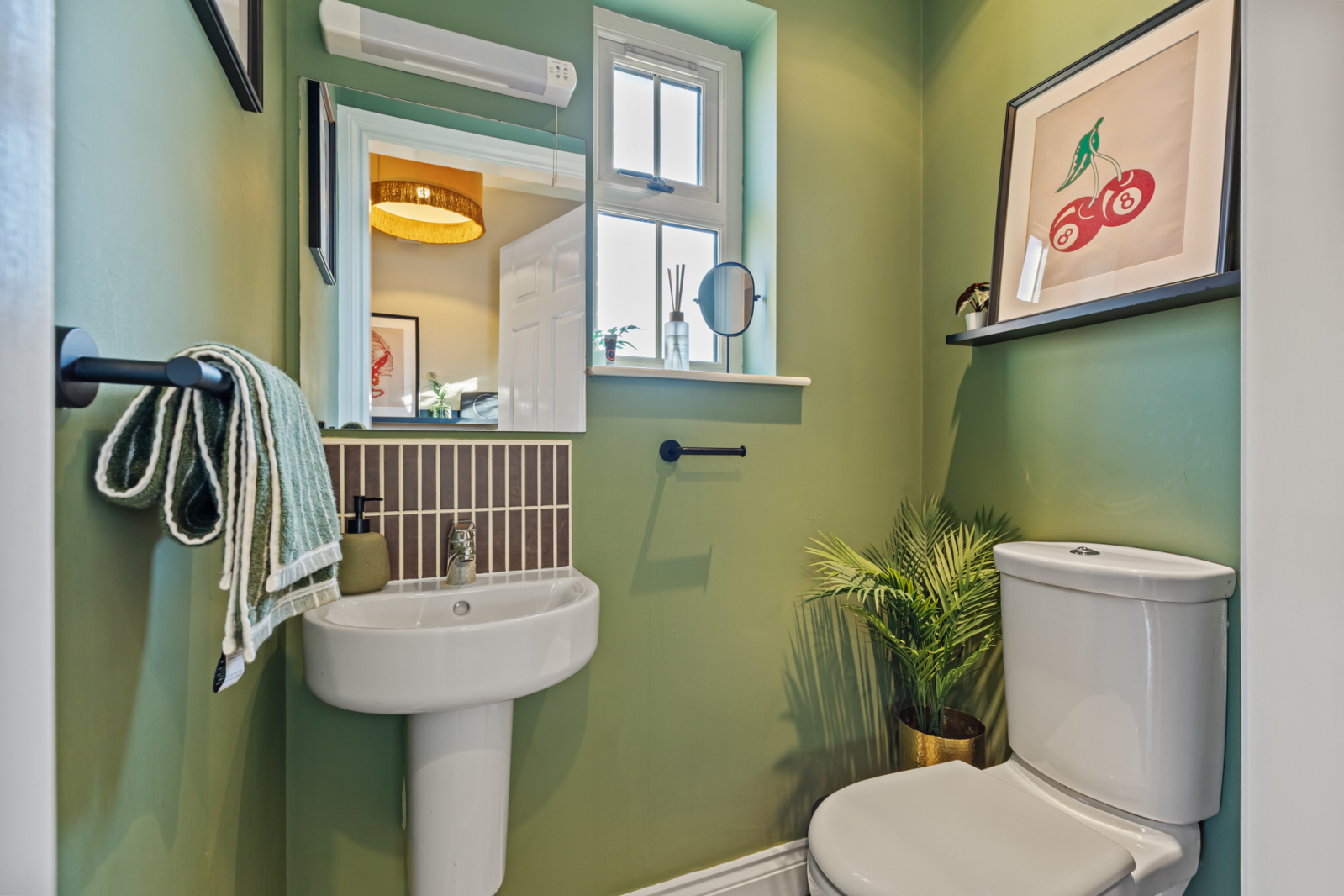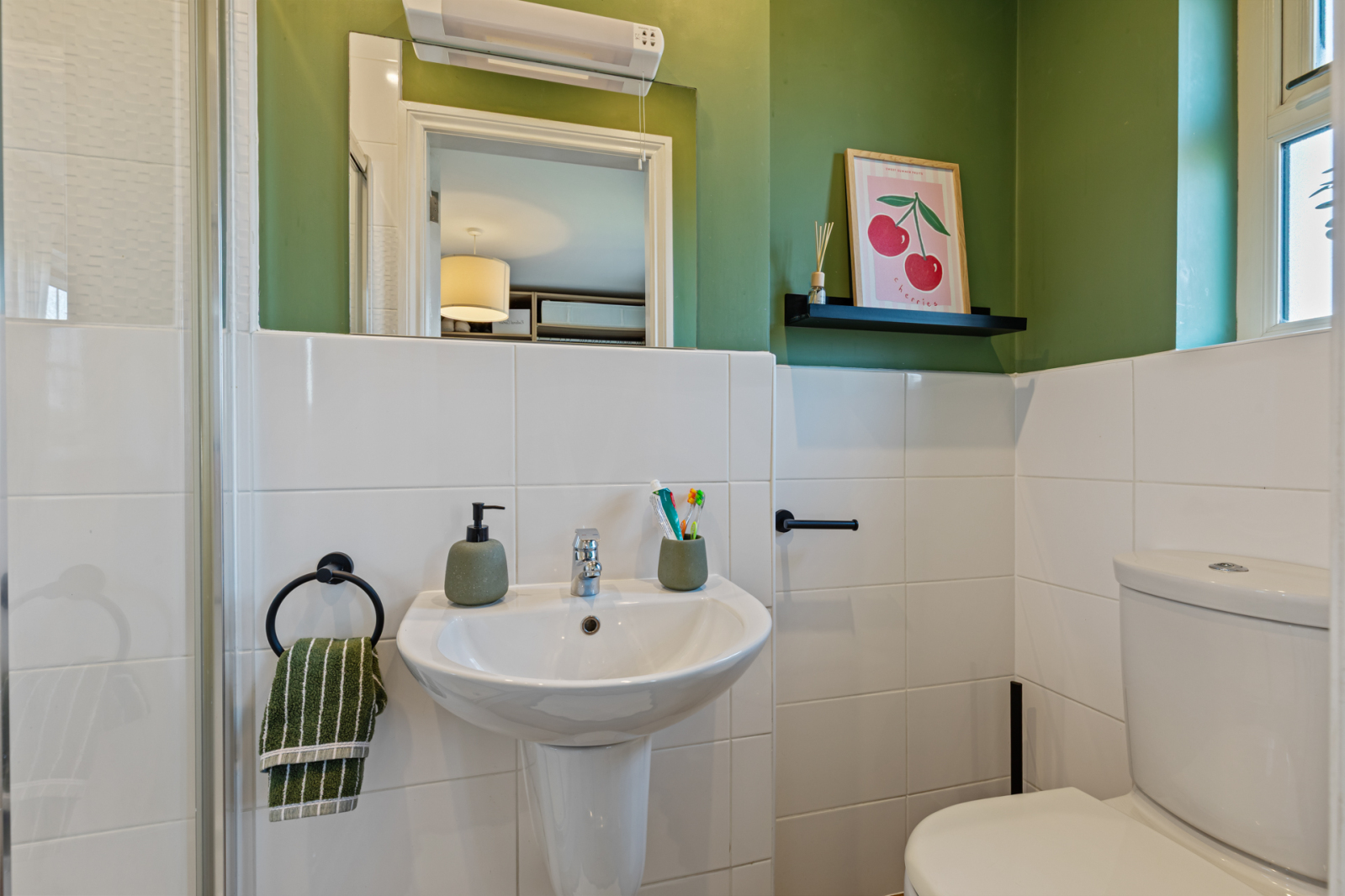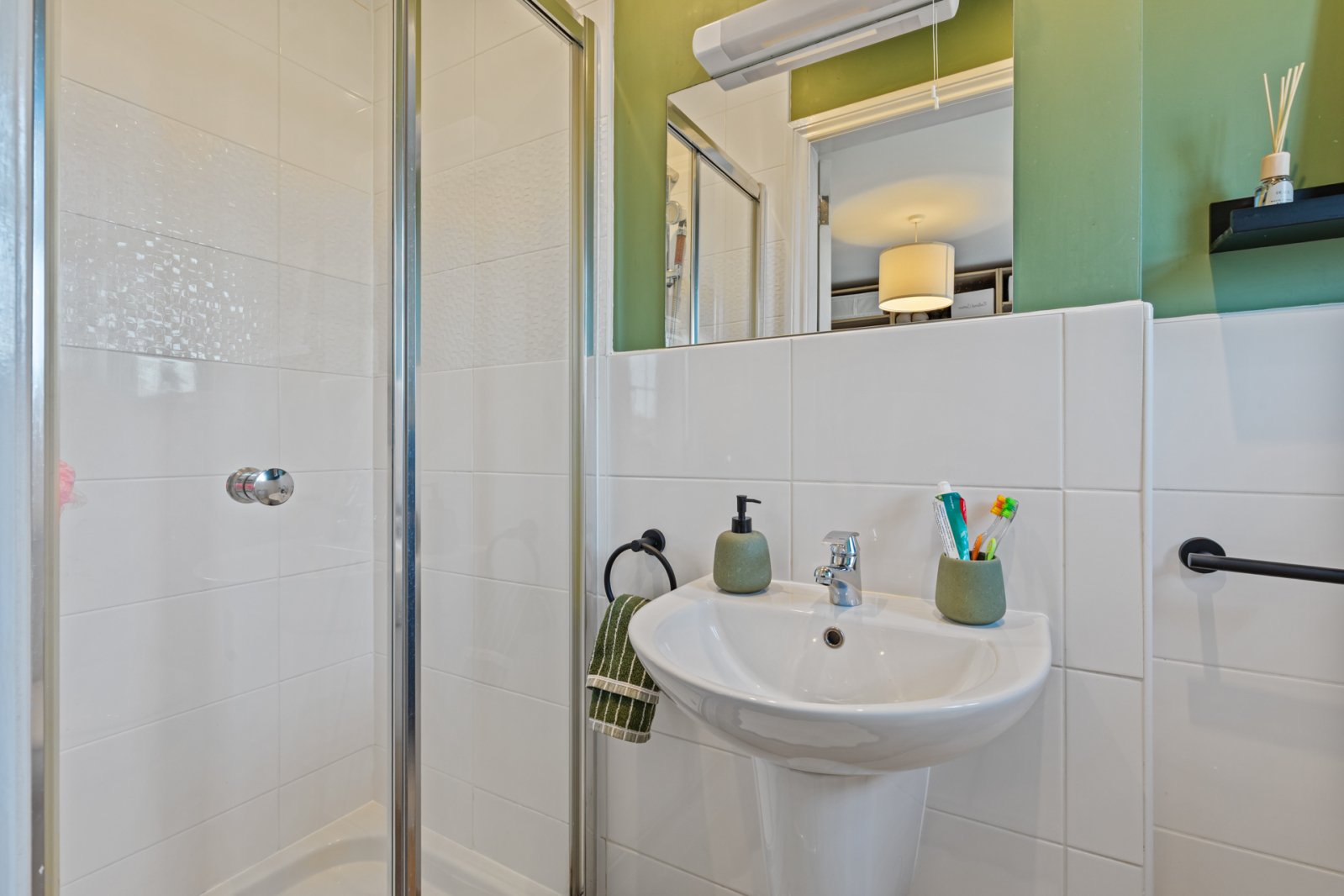 Fully tiled shower cubicle with thermostatic shower, semi pedestal wash hand basin with mixer taps, low flush WC, half tiled walls, ceramic tiled floor.
