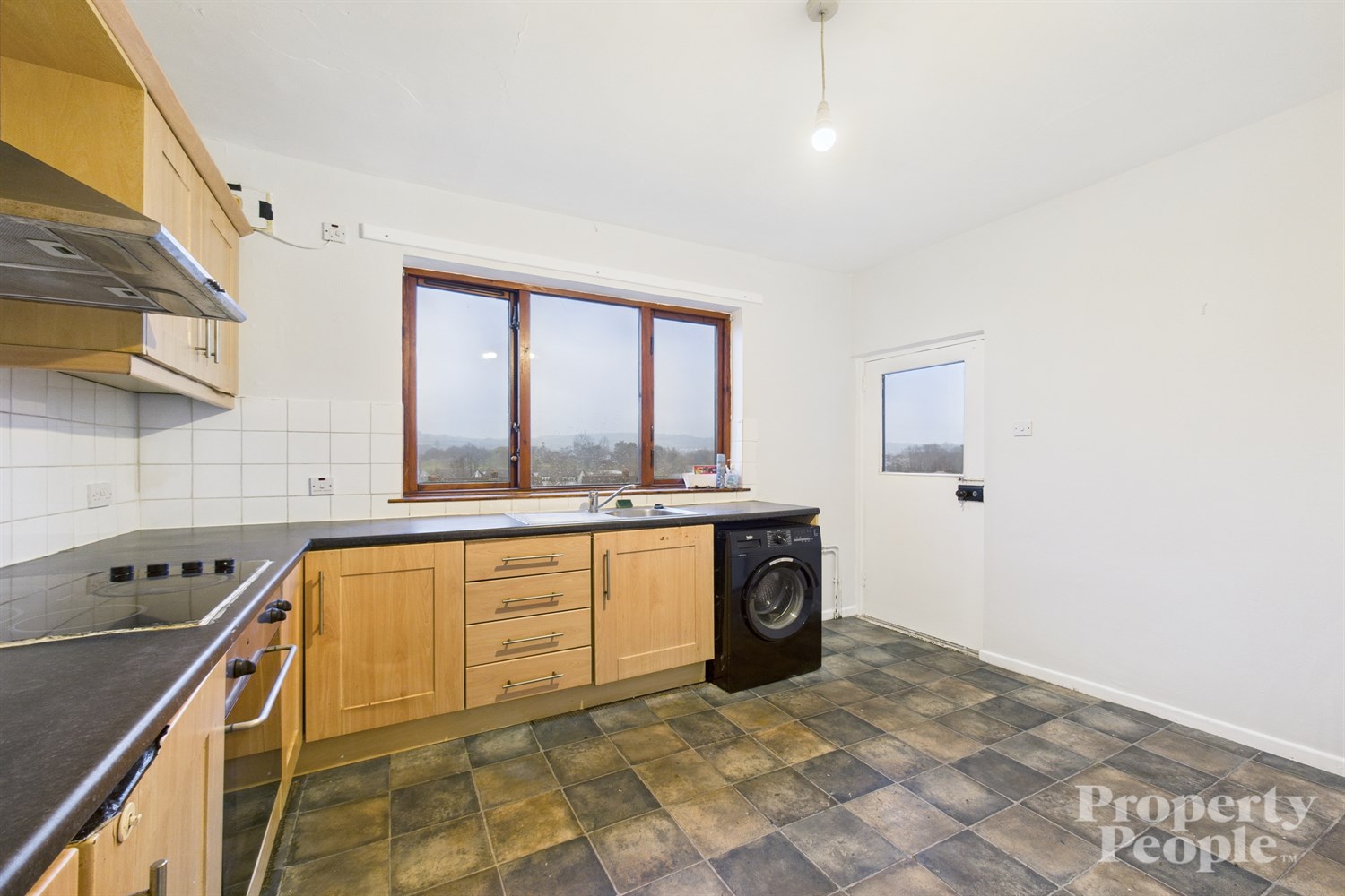 Well-appointed kitchen with ample space for casual dining. Fitted units with integrated oven, four-ring electric hob and stainless steel extractor fan. Stainless steel sink, space for freestanding fridge freezer and plumbing for washing machine. Partly tiled walls and lino flooring with tile effect. Rear door leading to balcony.