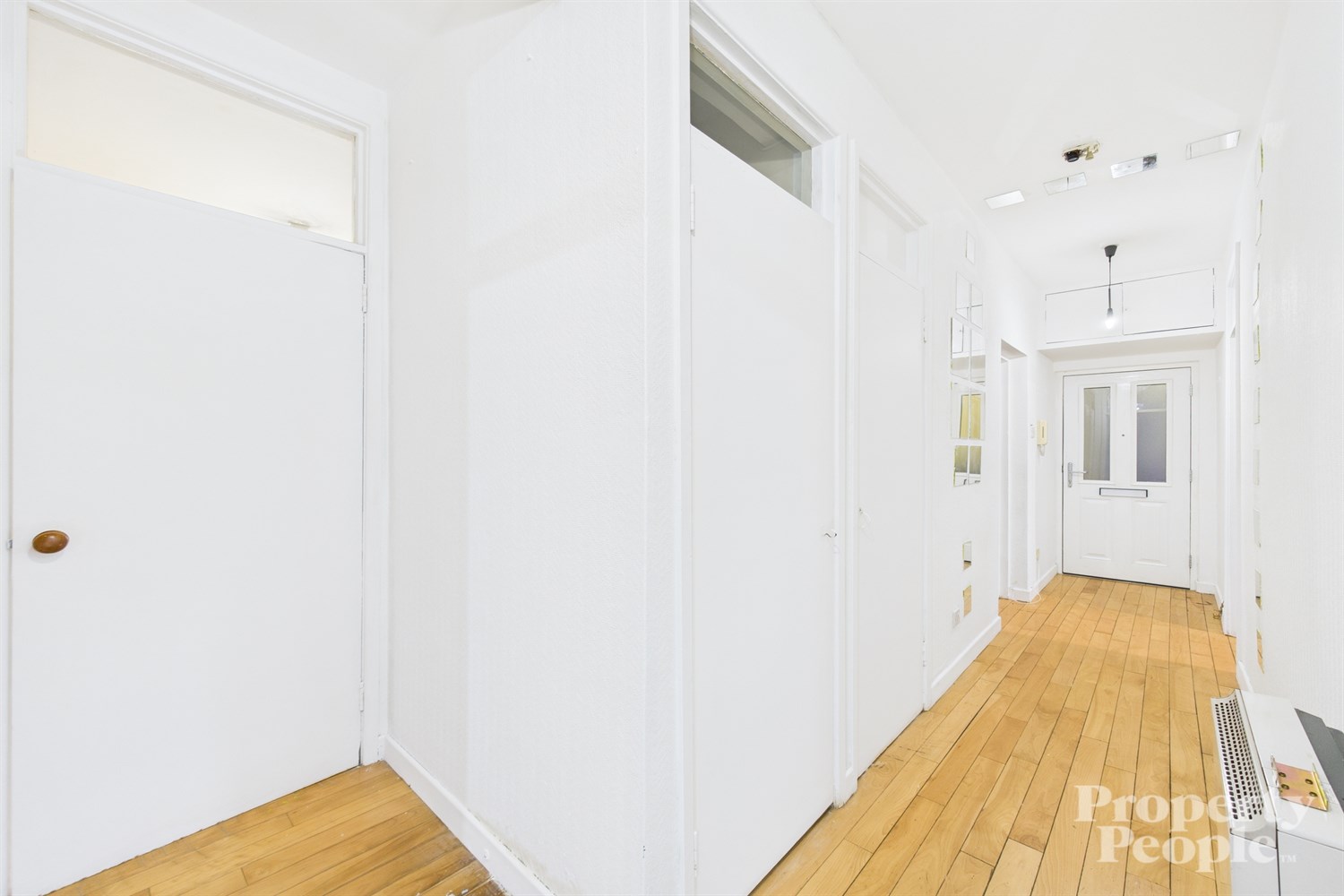 Bright and welcoming entrance hall with wooden flooring, electrical cupboard.