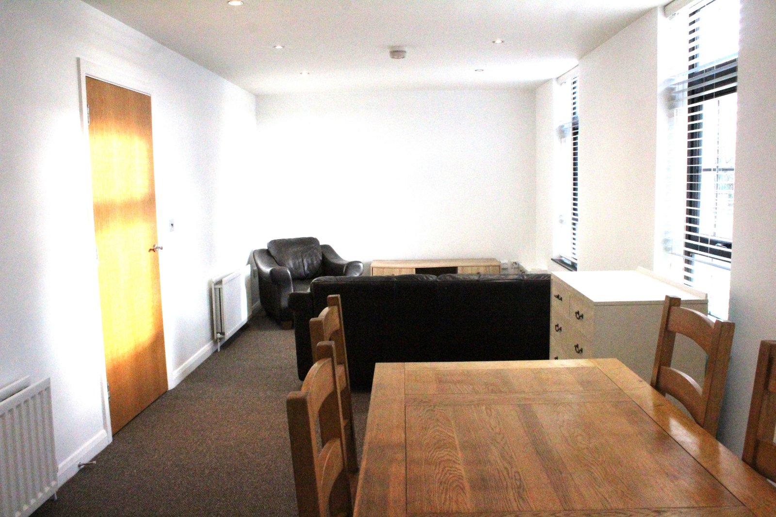 Bright Spacious Living/ Dining Area With Three Windows Maximizing Natural Light. Carpeted Flooring. Recessed Ceiling Lighting.