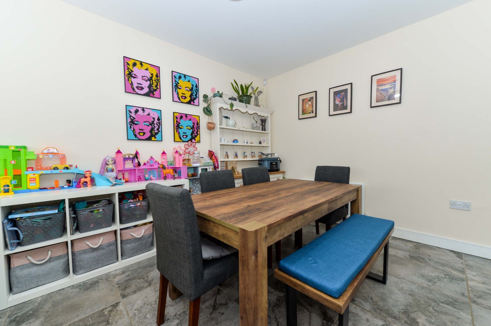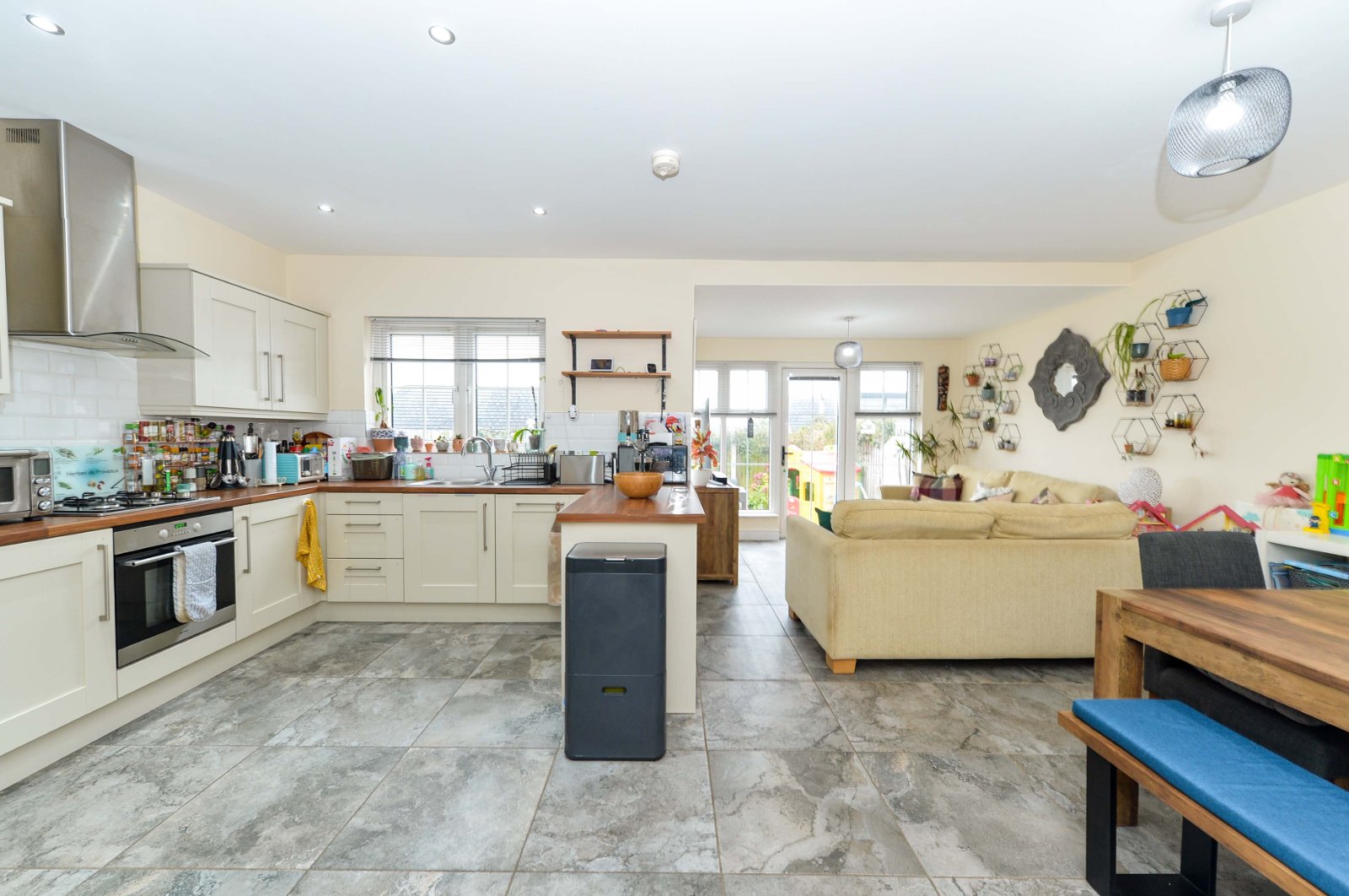 Single drainer bowl and one half stainless steel sink unit with mixer taps, excellent range of high and low level units, laminate work surfaces, brick effect tiled splash, stainless steel built in oven and four ring gas hob, stainless steel chimney extractor fan, integrated dishwasher, integrated fridge freezer, ample dining and family area, open to sun room.