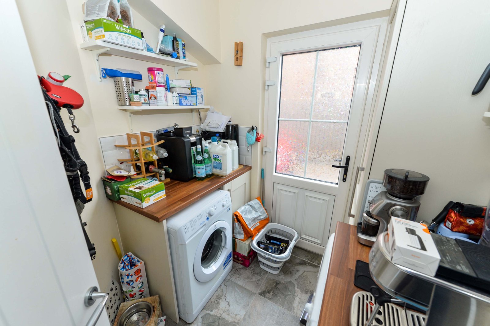 Sink unit, range of units, plumbed for washing machine, ceramic tiled floor, concealed gas boiler, built in tumble dryer, door to outside.