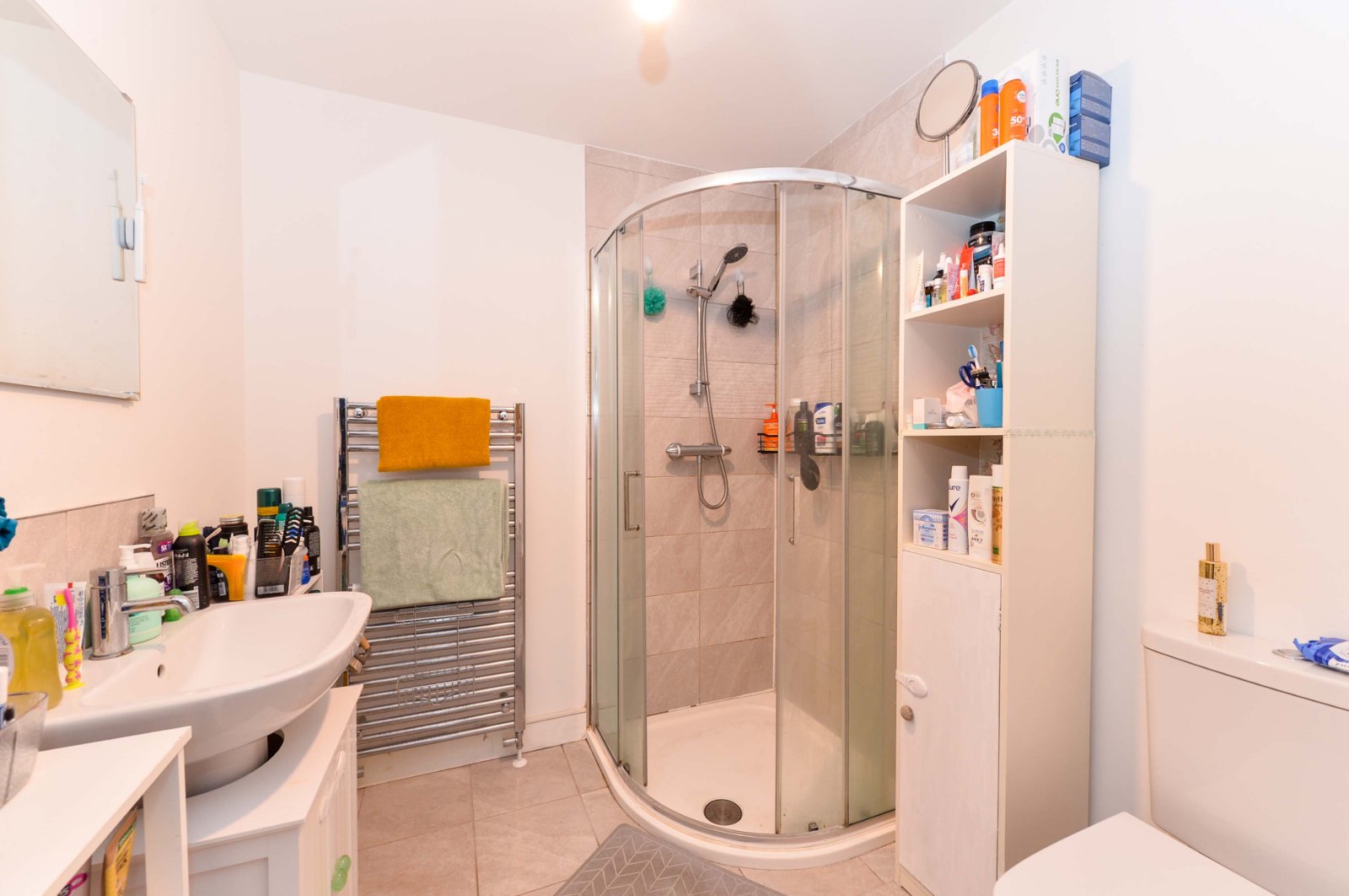 White suite, fully tiled built in shower cubicle with thermostatically controlled shower, ceramic tiled floor, pedestal wash hand basin with mixer taps and tiled splash back, dual flush close coupled WC.