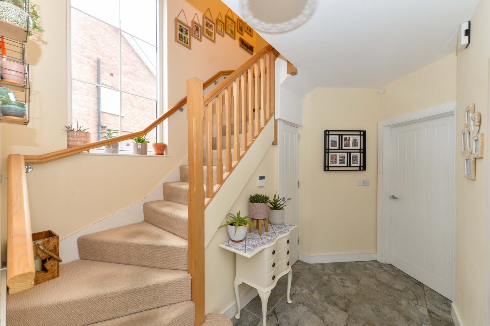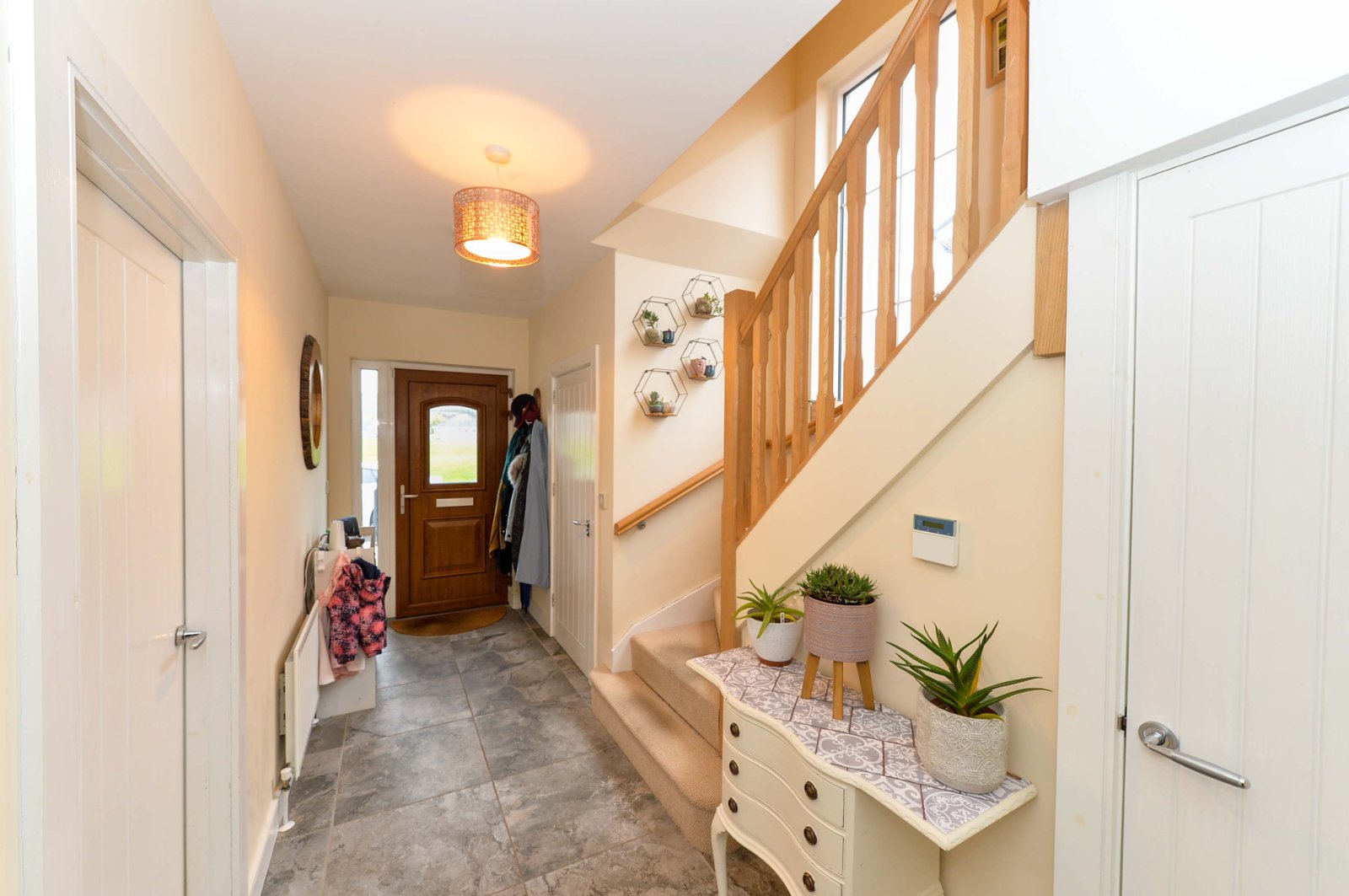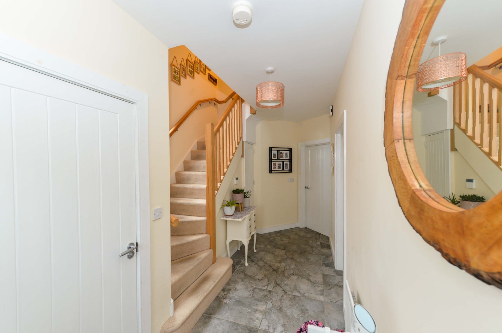 Front door with double glazed side panel to entrance hall, ceramic tiled floor, under stairs storage.