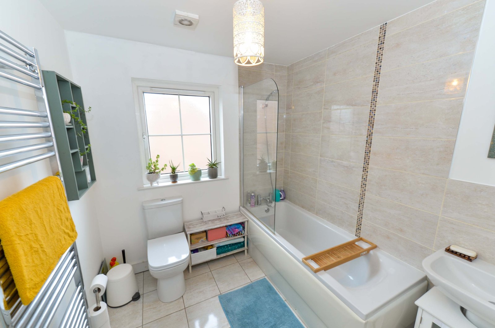 Panelled bath with mixer taps and telephone hand shower, tiled splash back, ceramic tiled floor, pedestal wash hand basin with mixer taps and tiled splash back, dual flush close coupled WC, chrome heated towel rail.