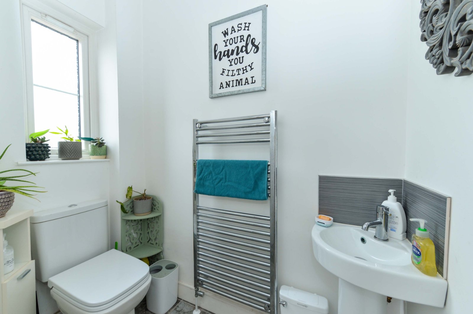 White suite, dual flush close coupled WC, pedestal wash hand basin with mixer taps and tiled splash back, ceramic tiled floor, chrome heated towel rail.