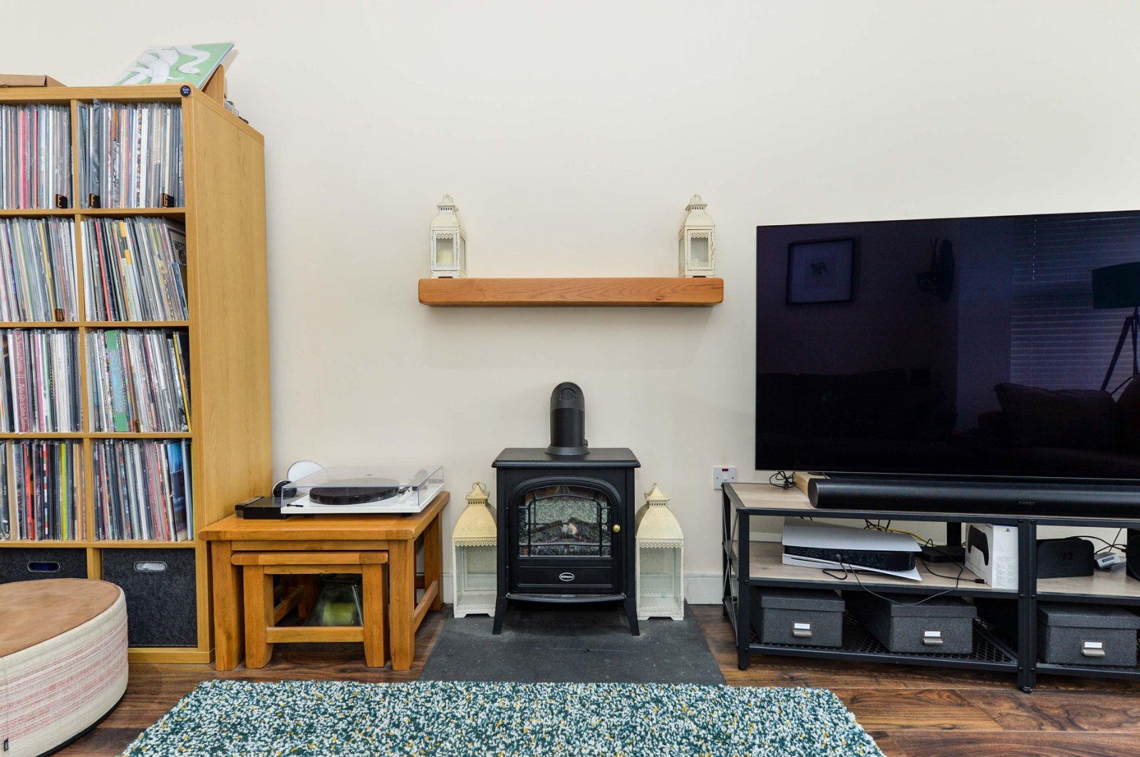 Electric stove with slate hearth and timber mantle, wooden floor, recessed spotlights, square bay.