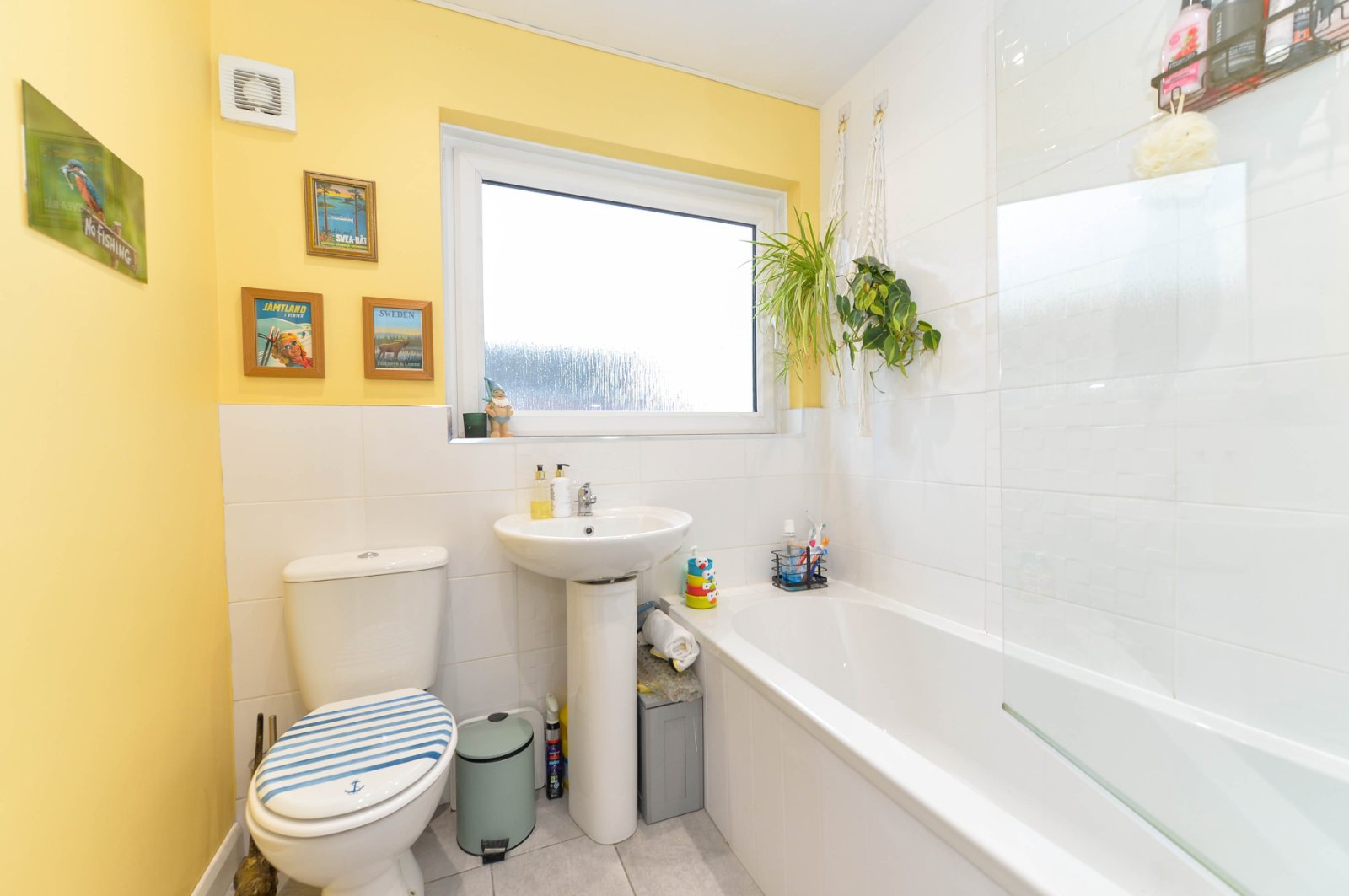 White suite, panelled bath, Triton electric shower, tiled splash back, ceramic tiled floor, chrome heated towel rail, pedestal wash hand basin with mixer taps, dual flush close coupled WC, recessed spotlights, tongue and groove ceiling.