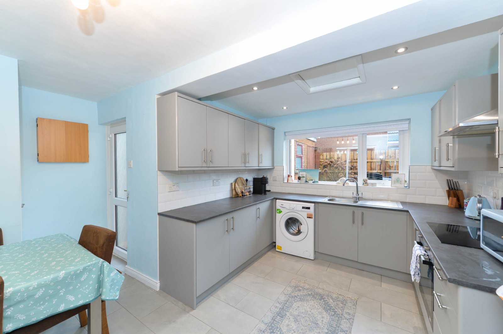 Single drainer stainless steel sink unit with mixer taps, excellent range of high and low level units with laminate work surfaces, brick effect tiled splash back, stainless steel built in oven and four ring ceramic hob, stainless steel chimney extractor fan, ceramic tiled floor, plumbed for washing machine, recessed spotlights, under stairs storage, uPVC double glazed back door.