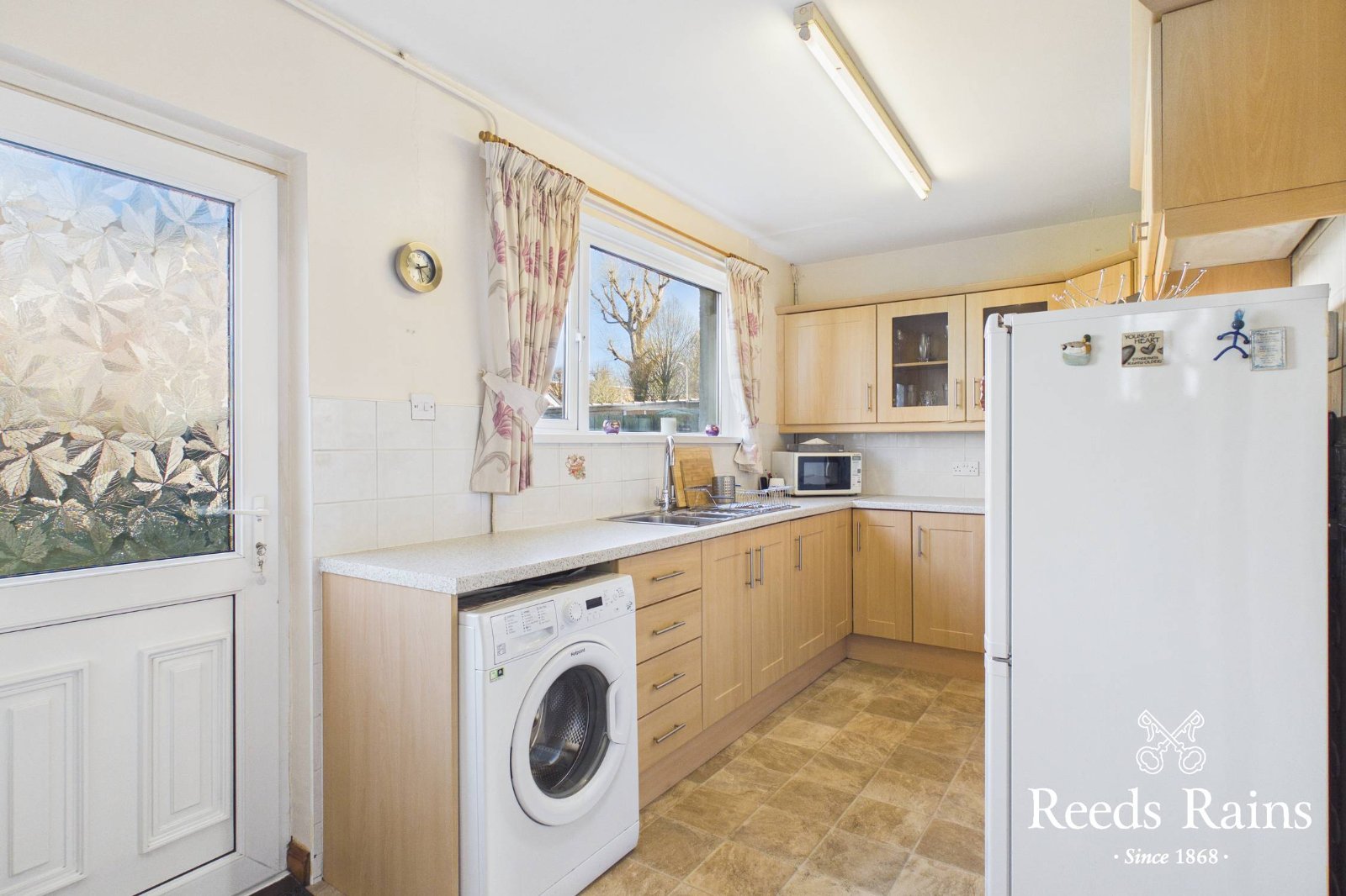 Single drainer bowl and one half stainless steel sink unit with mixer taps, range of high and low level units, laminate work surfaces, tiled splash back, cooker space, stainless steel chimney extractor fan, glazed display cabinets, plumbed for washing machine, uPVC double glazed back door.