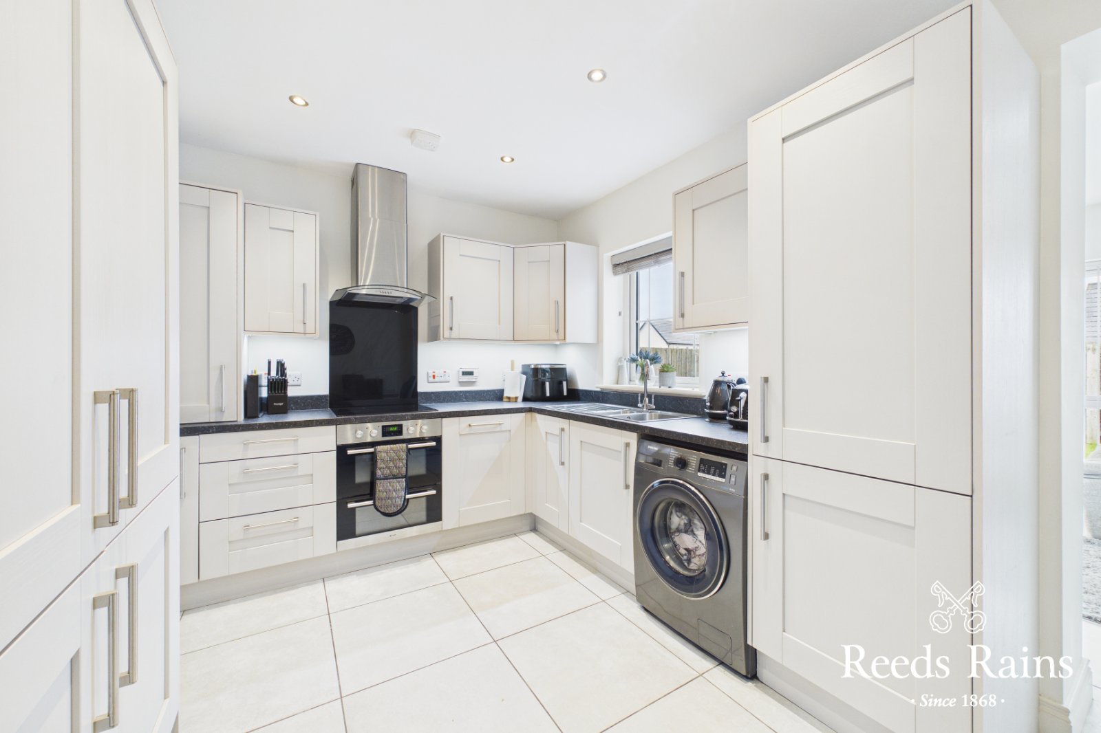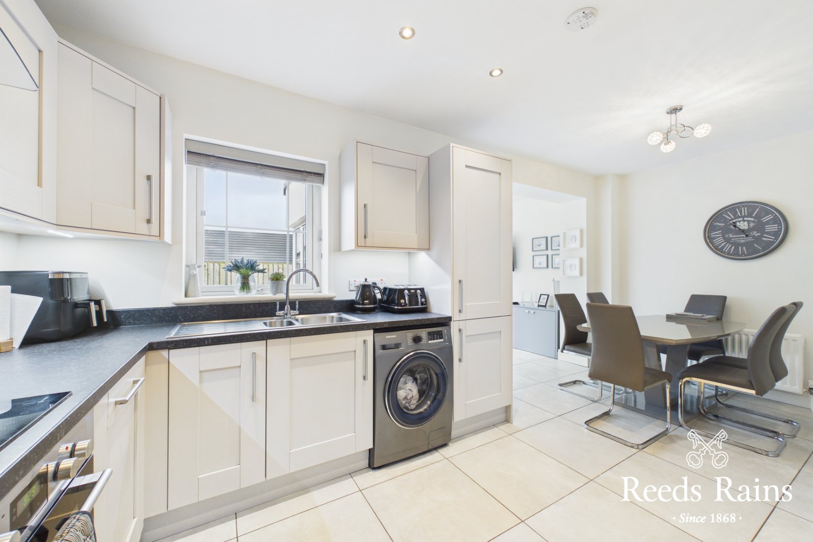 One and 1/2 bowl sink unit with chrome dual mixer tap. Excellent range of high and low level soft closing units with stainless steel door furniture, formica work surfaces and up stand. Integrated four ring electric hob and built in double oven with chimney extractor fan. Integrated dishwasher. Integrated fridge / freezer. Plumbed for washing machine. Built in storage with Worchester gas fired boiler. Large built in larder cupboard. Concealed strip lighting. Recessed spotlighting. Ample dining area. Ceramic tiled flooring.