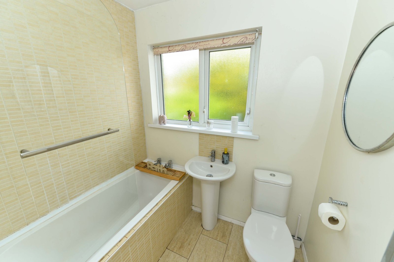 White suite, tiled panelled bath, electric shower unit, tiled splash back, dual flush close coupled WC, ceramic tiled floor, chrome heated towel rail, pedestal wash hand basin with mixer taps and tiled splash back.