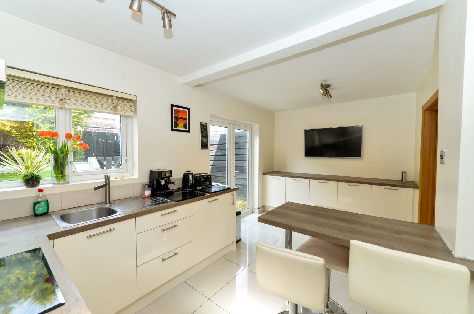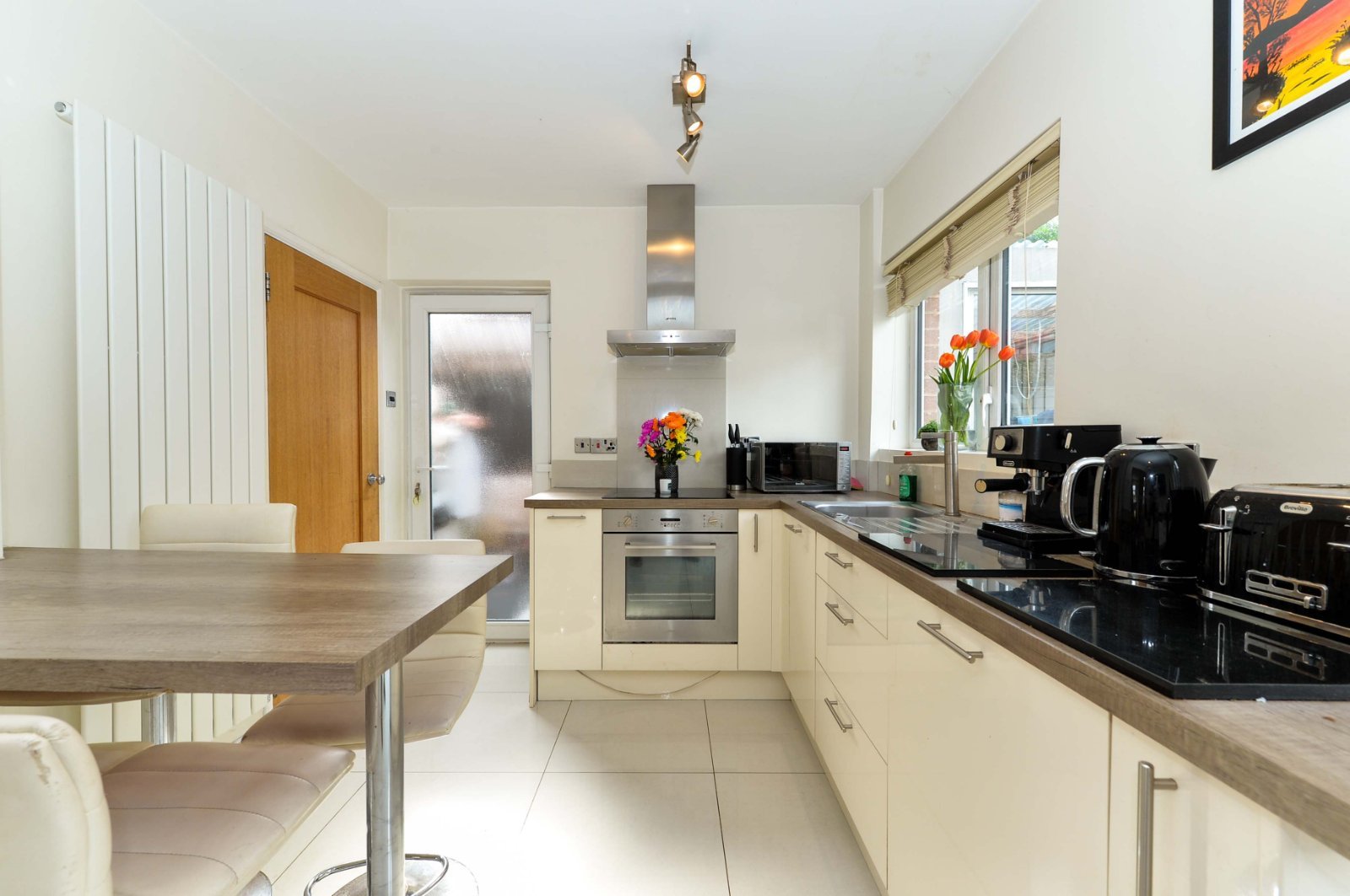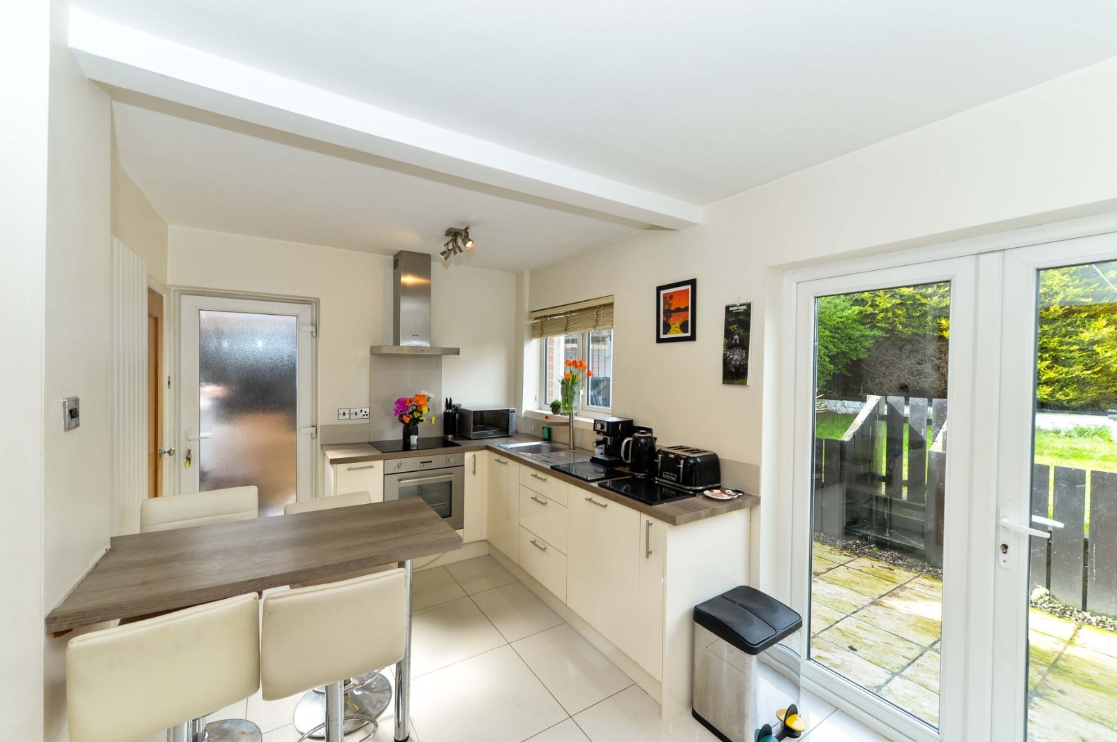 Single drainer stainless steel sink unit with mixer taps, range of low level units, laminate work surfaces, tiled splash back, ceramic tiled floor, integrated dishwasher, stainless steel built in oven an four ring ceramic hob, stainless steel chimney extractor fan, breakfast bar, under stairs storage, double glazed French doors to rear garden and double glazed side door.