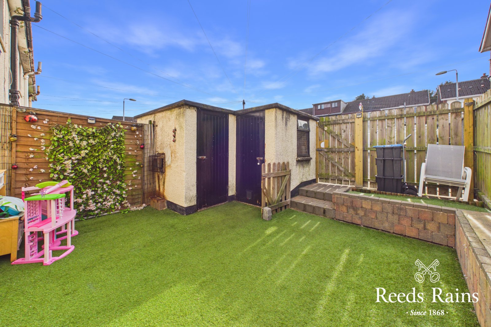 Front garden in loose stones. Rear garden in artificial grass. Boiler house and additional store.