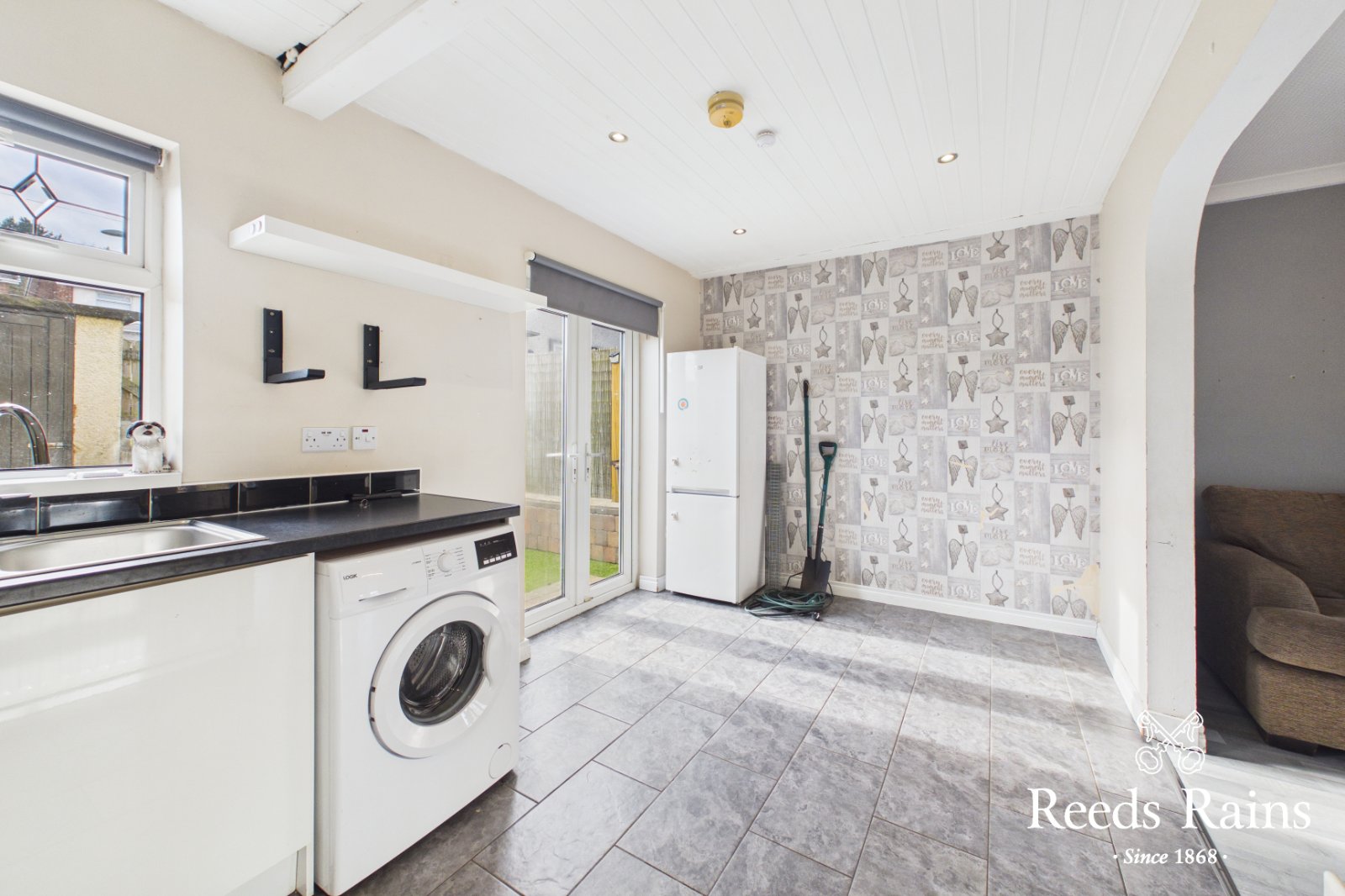 Range of high and low level units with stainless steel door furniture. Single drainer sink and mixer taps. Built in stainless steel oven, four ring hob and stainless steel chimney extractor fan. French doors to rear garden. Tongue and groove ceiling. Spotlights. Part tiled walls.