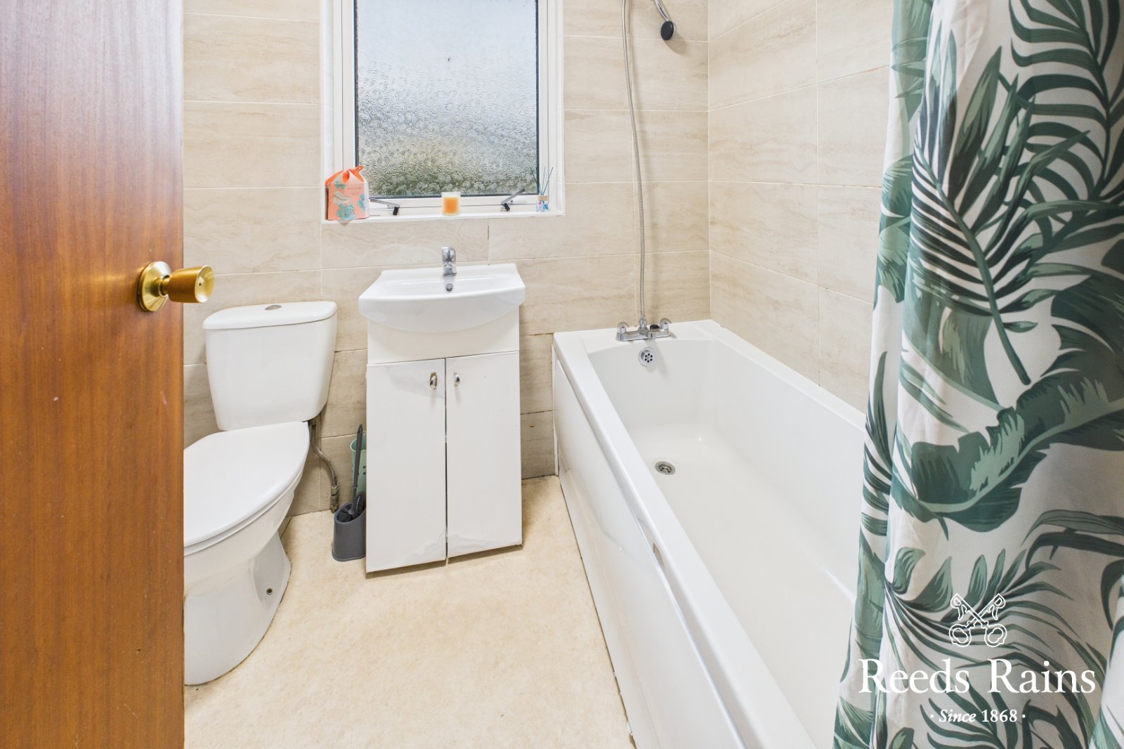 White suite comprising low flush WC, vanity unit with mixer tap and panel bath with shower over. Extractor fan. Wall and floor tiling.