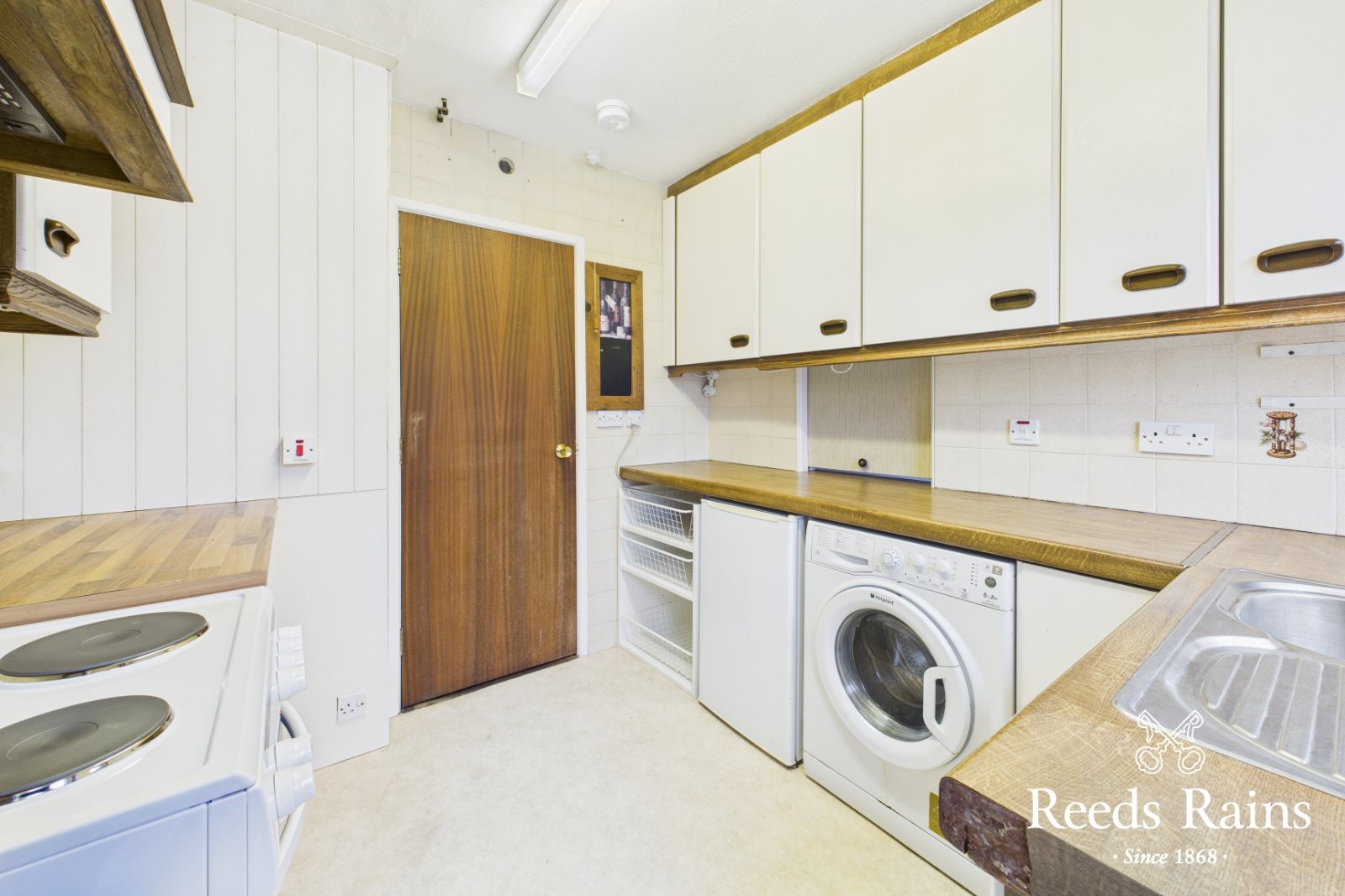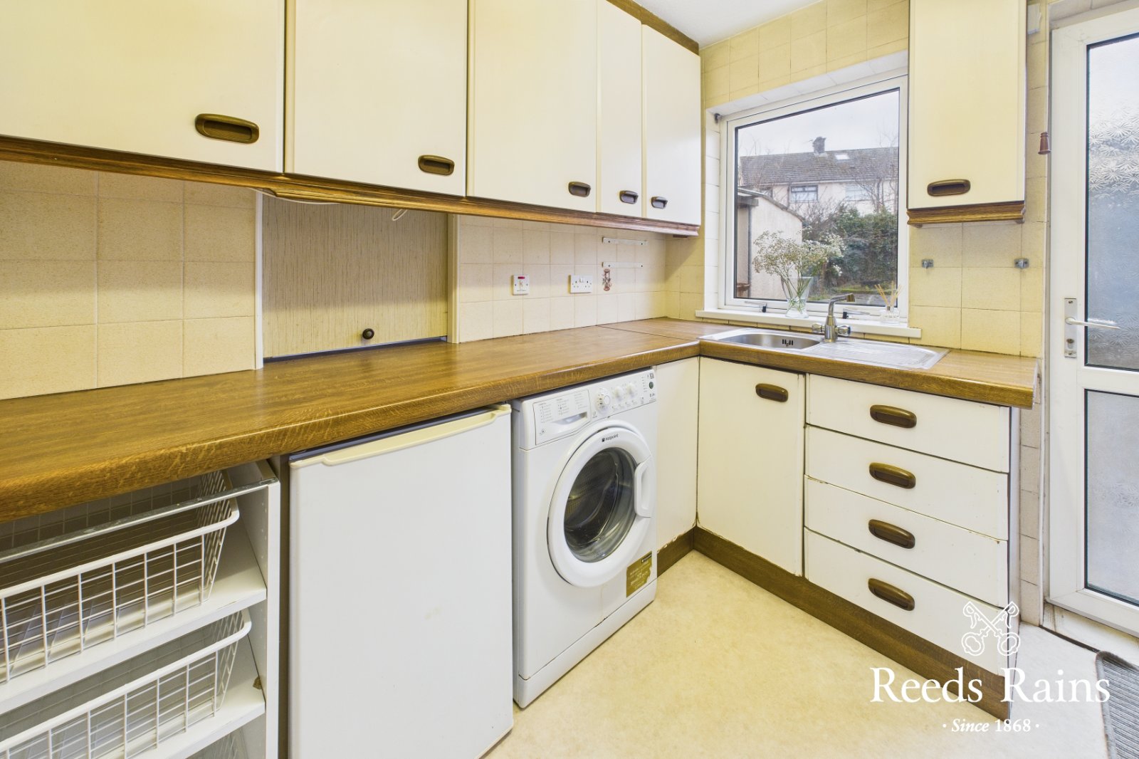 Single drainer stainless steel sink unit with mixer taps, range of high and low level units, cooker space, fridge space, plumbed for washing machine, fully tiled walls, door to garden.