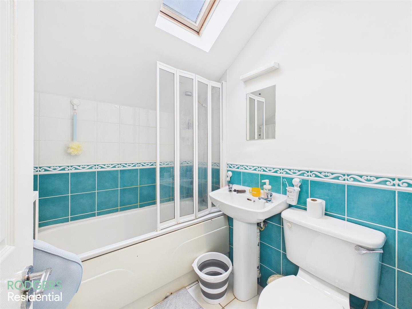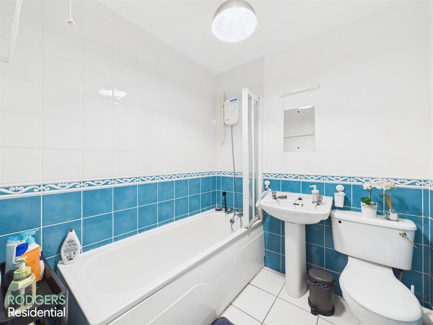 Pedestal Sink With Chrome Mixer Taps, Low Flush WC, Panelled Bath With Overhead Electric Shower Unit, Fully Tiled Walls and Flooring, Extractor Fan