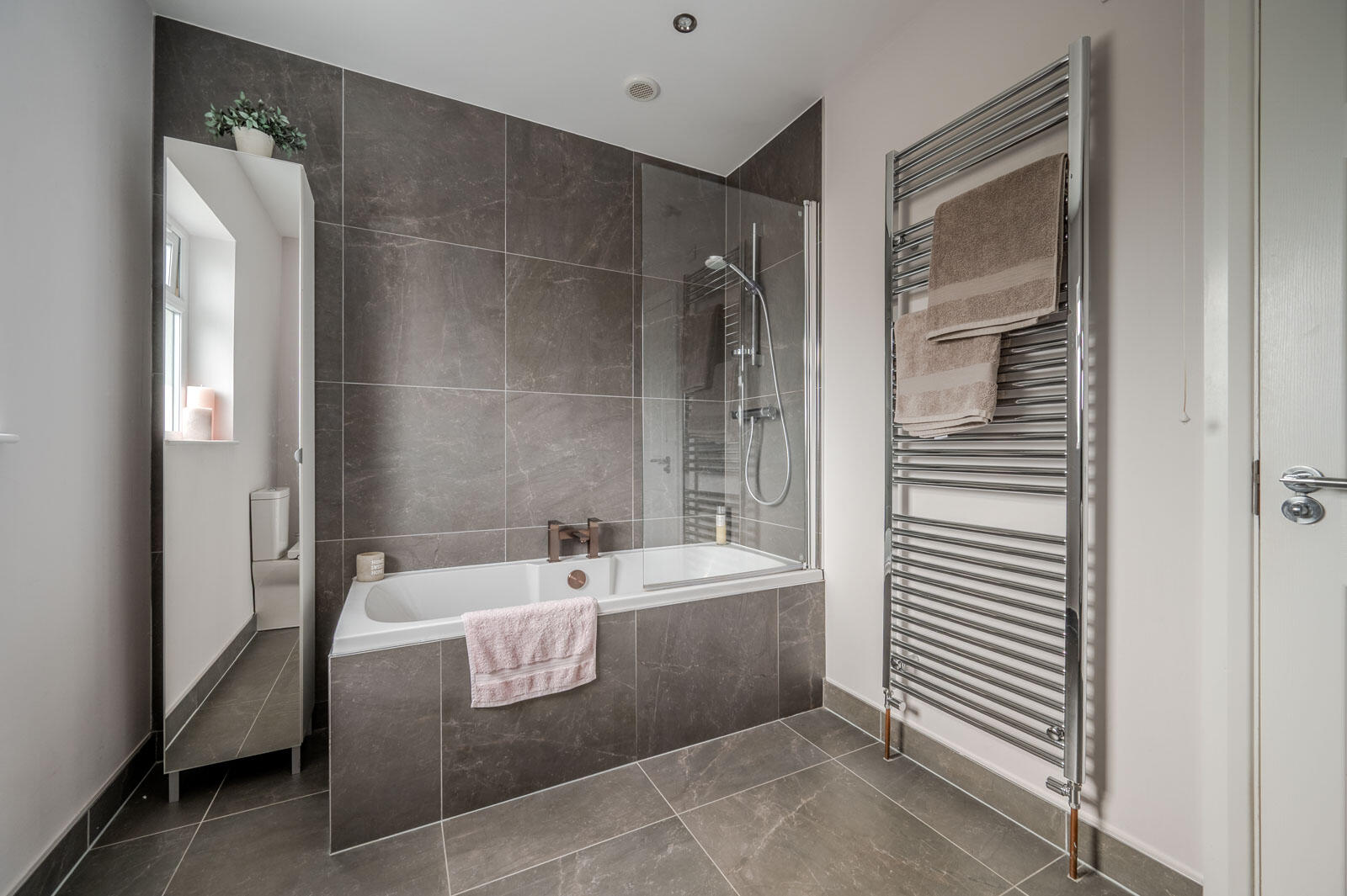 White suite comprising of low flush WC, half pedestal wall hung wash hand basin with mixer taps, feature herringbone effect tile splashback, tiled floor and skirting boards, panelled bath with mixer taps, thermostatically controlled shower, telephone handle attachment, glazed shower screen, chrome heated towel rail, inset spotlights.