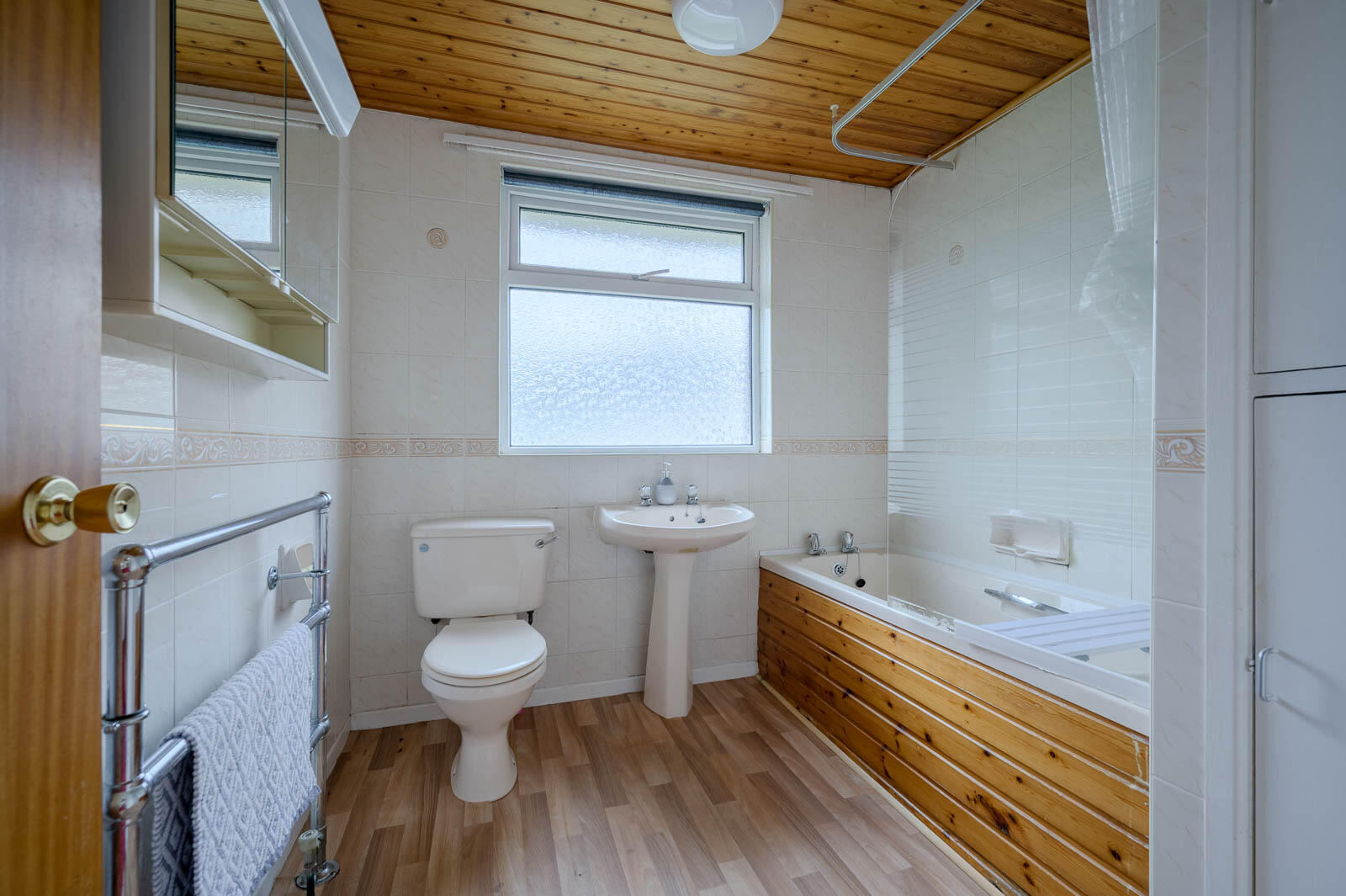 Cream suite comprising of low flush WC, pedestal wash hand basin with hot and cold taps, panelled bath with hot and cold taps, thermostatically controlled shower, telephone handle attachment, tiled walls, laminate wood effect floor, chrome heated towel rail, hotpress cupboard with shelving.