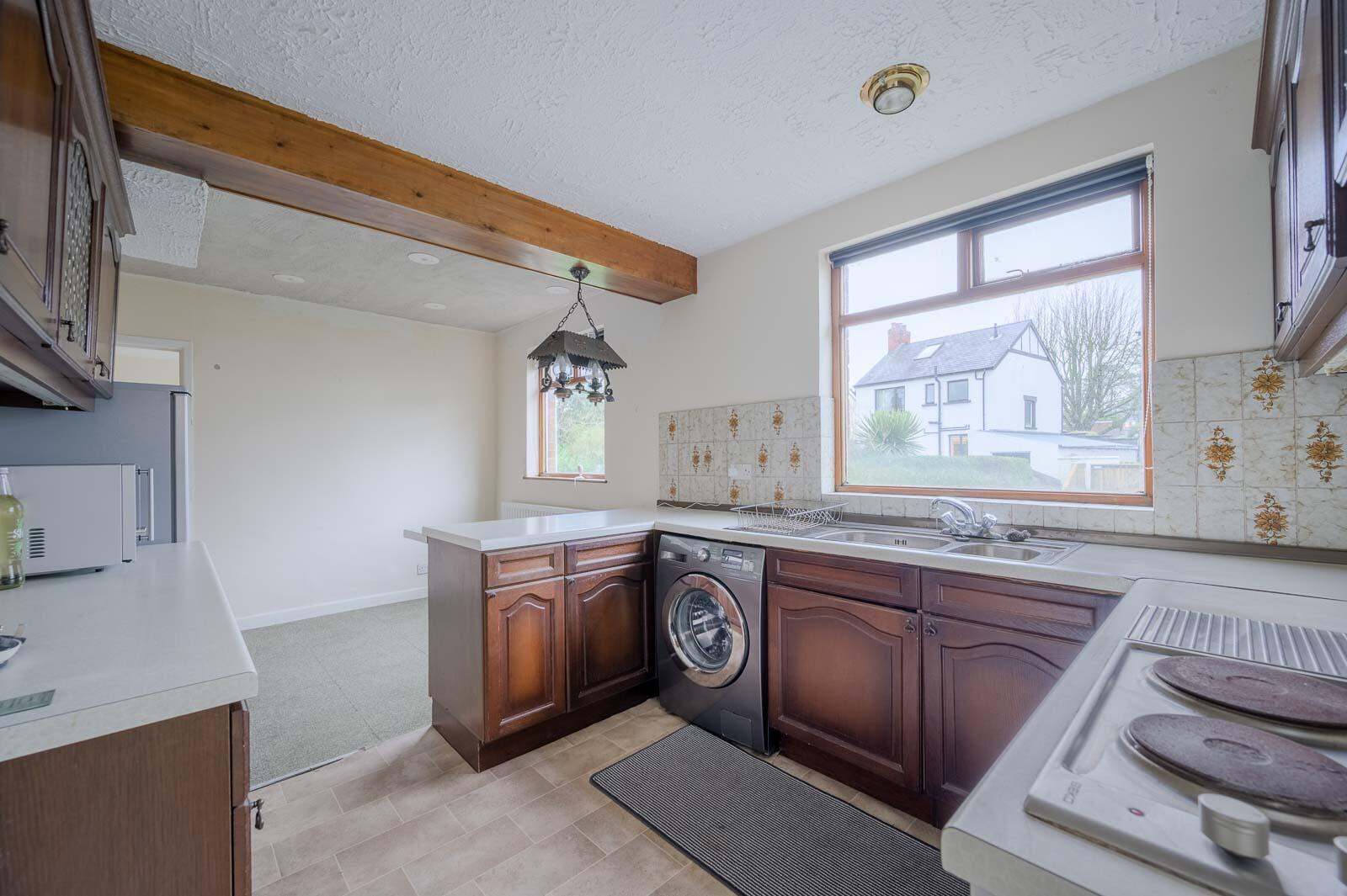 Range of high and low level units, integrated oven, four ring hob above, enclosed extractor fan, stainless steel sink and a half with drainer and chrome mixer tap, space for washing machine, space for fridge freezer, peninsula breakfast bar/dining area, laminate work surface. Access door to side. Ample space for dining and outlook to rear garden.