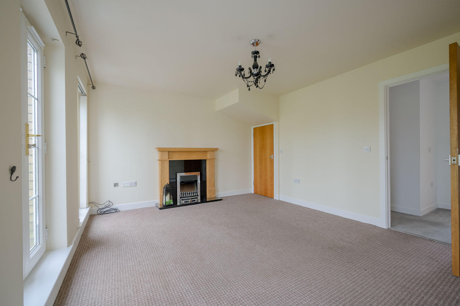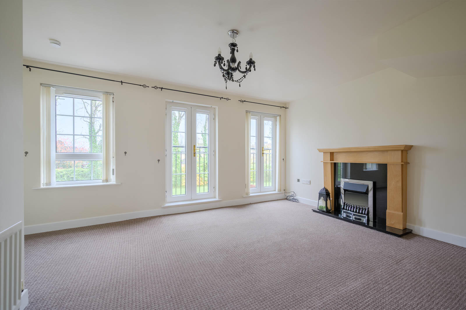 Outlook to front, wooden fireplace with electric fire insert and uPVC double glazed French doors to Juliet balcony x two.