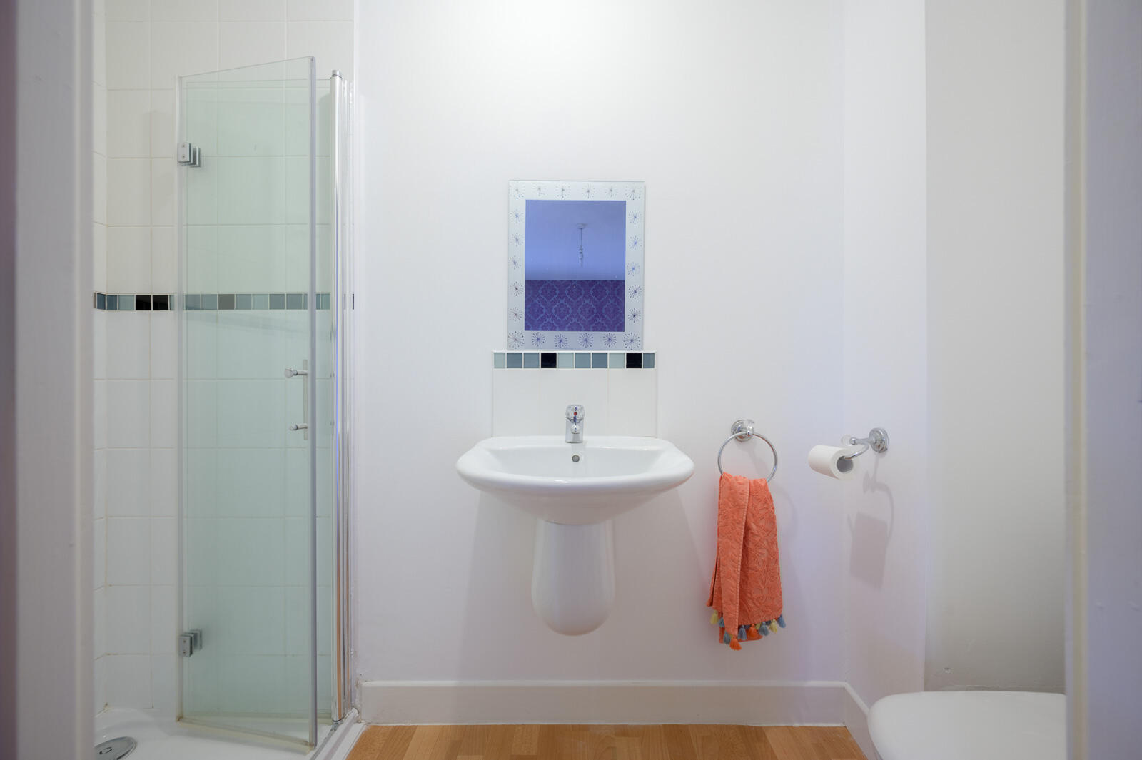 Modern white suite comprising low flush WC with push button, floating wash hand basin with chrome mixer tap, tiled splashback, fully tiled shower cubicle with electric shower and telephone hand unit, vinyl flooring, extractor fan.