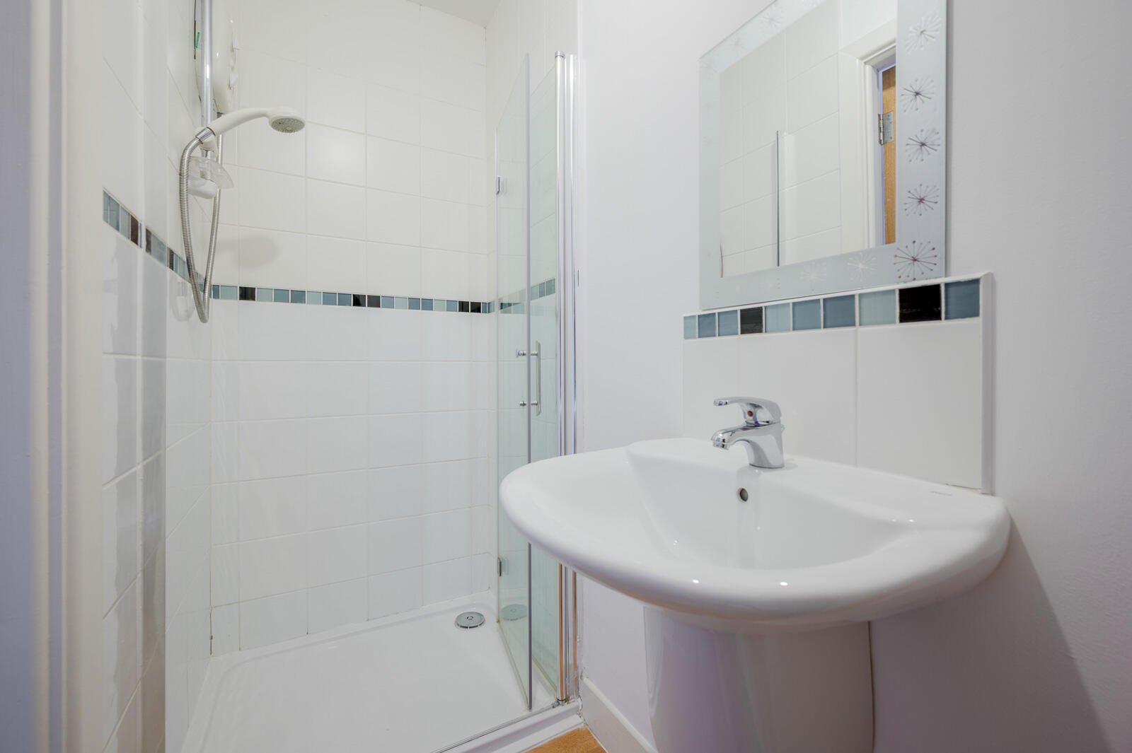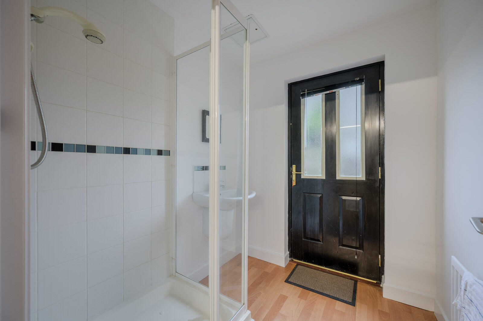 White suite comprising pedestal wash hand basin with chrome mixer tap, tiled splashback, fully tiled shower cubicle with electric shower and telephone hand unit, vinyl flooring, extractor fan, wooden glazed door to rear garden.
