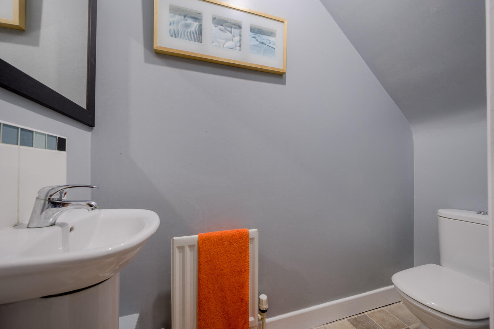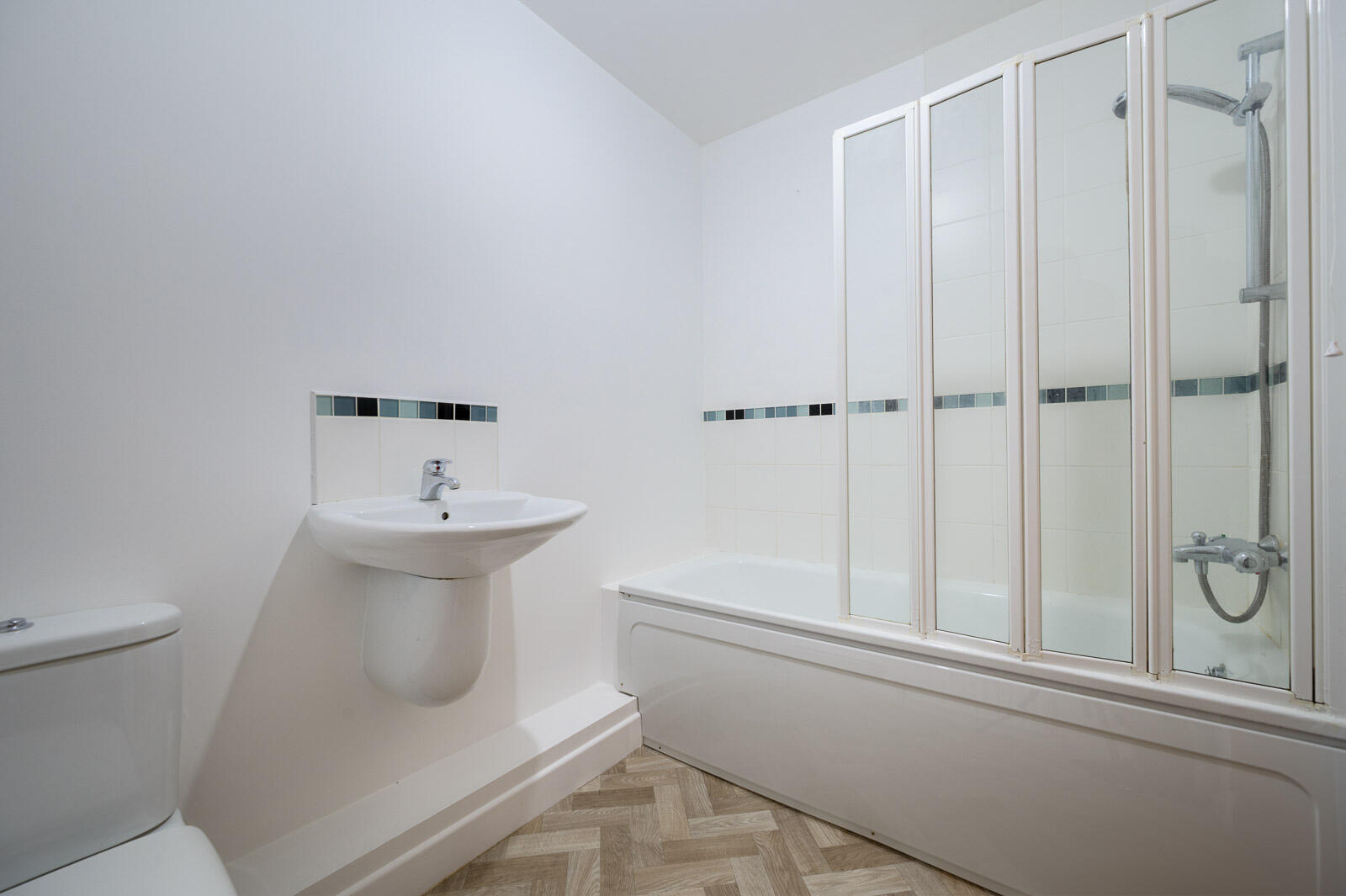 White suite comprising low flush WC with push button, floating wash hand basin with chrome mixer tap, tiled splashback, fully tiled bath with thermostatically controlled valve and telephone hand unit, vinyl flooring, frosted glass window.