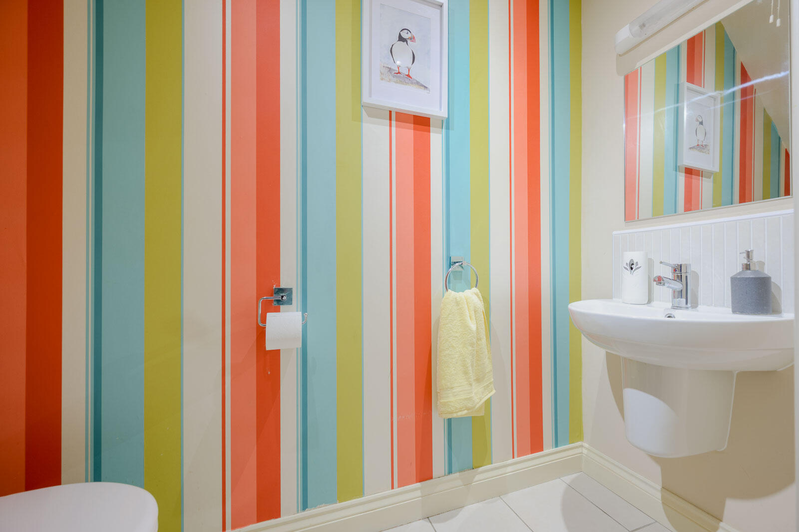 With modern white suite comprising low flush WC, floating wash hand basin, chrome mixer tap, tiled splashback, ceramic tiled floor, extractor fan, recessed spotlighting, electrical fuse box.