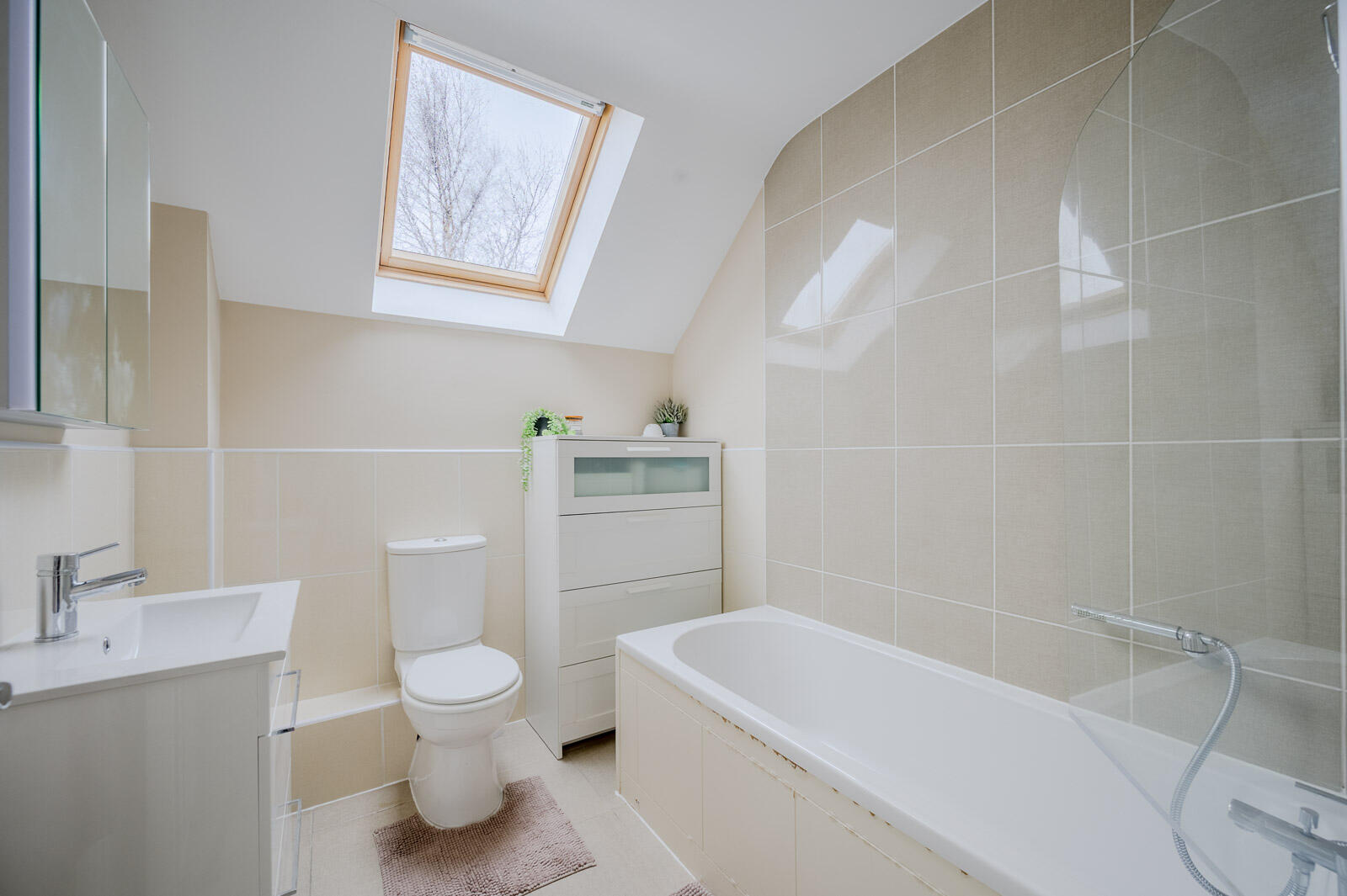 Modern white suite comprising low flush WC, vanity unit, chrome mixer tap, drawer unit below, illuminated mirrored bathroom cabinet above, panelled bath with chrome mixer taps and telephone hand shower, glazed shower screen, fully tiled splashback with thermostatically controlled chrome shower unit, ceramic tiled floor, Velux window, recessed LED spotlighting, extractor fan.