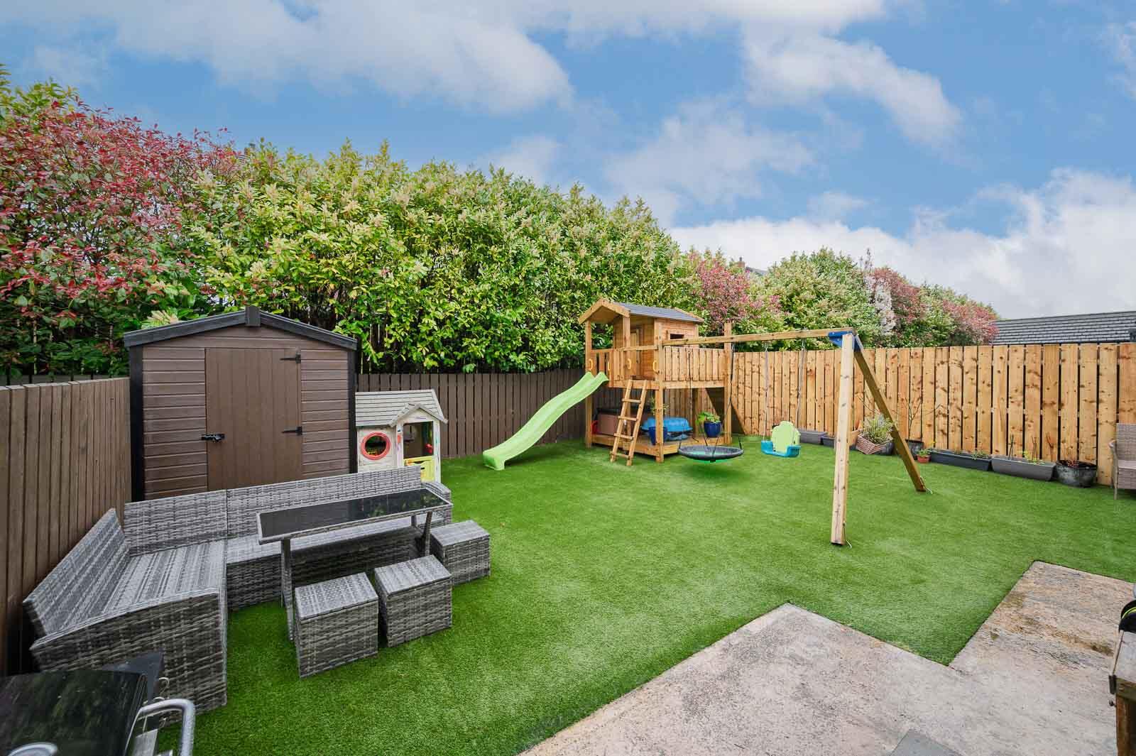 Tarmac driveway with ample parking to front and side, enclosed easily maintained rear garden laid in patio areas and artificial grass, ideal for children at play, Jungle Gym, garden shed, outdoor light, water tap.
