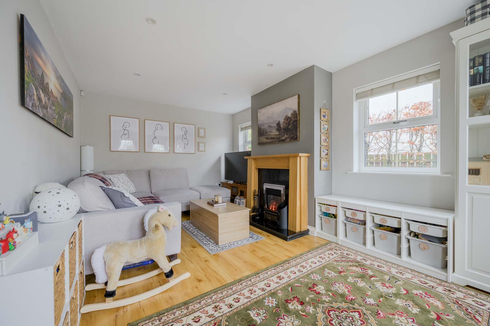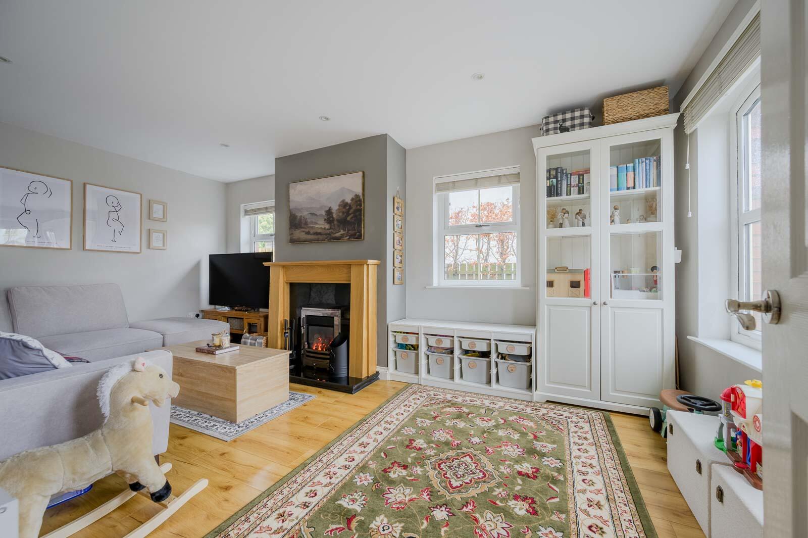 The ground floor comprises a covered entrance porch leading to a spacious reception hall with oak wooden flooring and cloaks area. A generous lounge features a contemporary fireplace with gas coal fire and dual aspect outlook. The impressive open-plan kitchen, dining, and living space is fitted with a modern range of units and integrated appliances, with ample space for dining and relaxation, and French doors opening to the rear garden. A ground floor WC completes the accommodation.