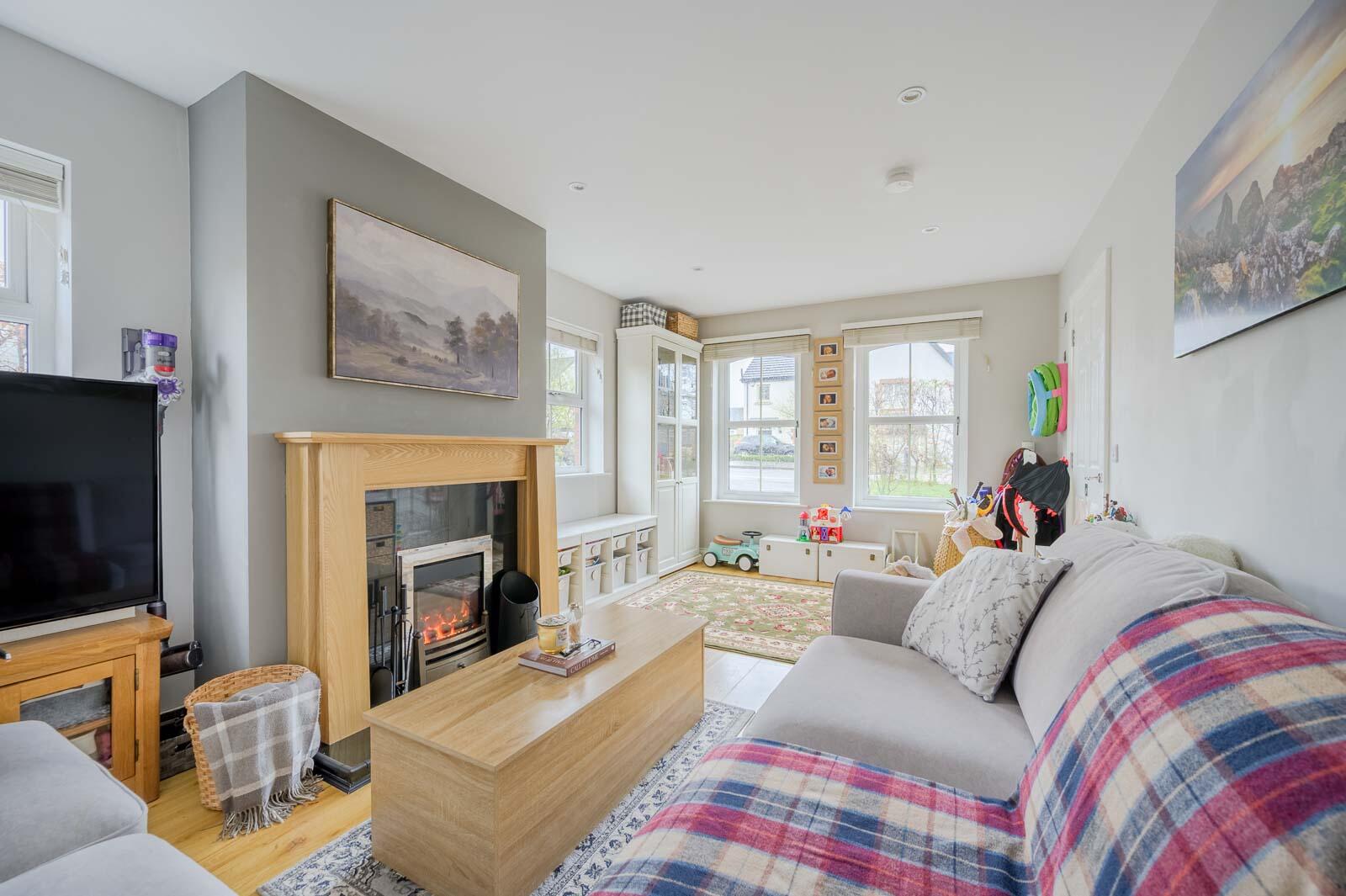 Oak wooden flooring, oak modern fireplace surround with granite inset and hearth, gas coal fire, chimney breast flanked by windows with outlook to side, also mature outlook to front, recessed LED spotlighting.