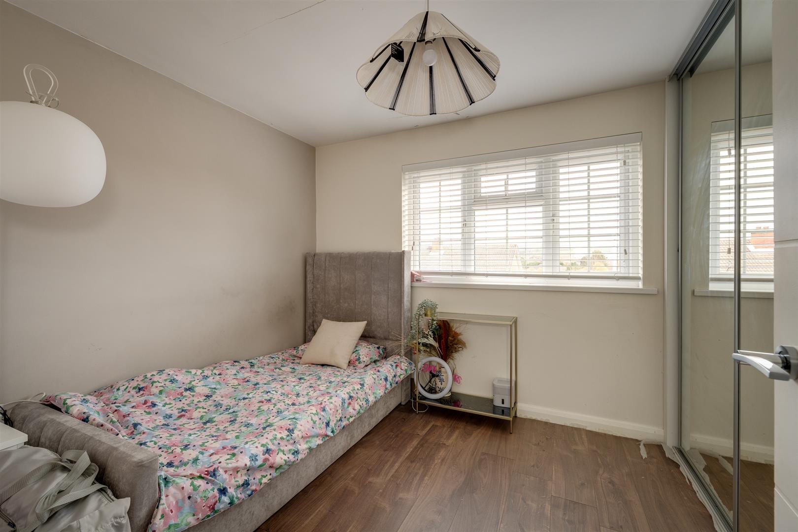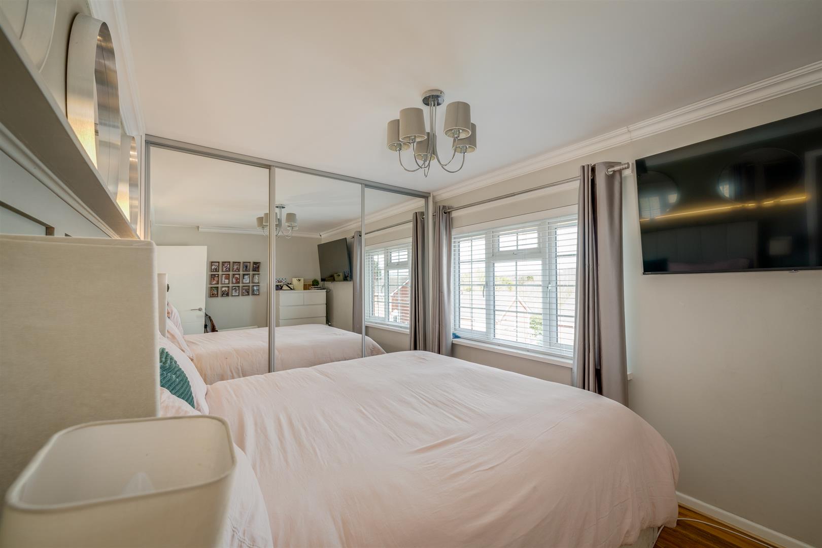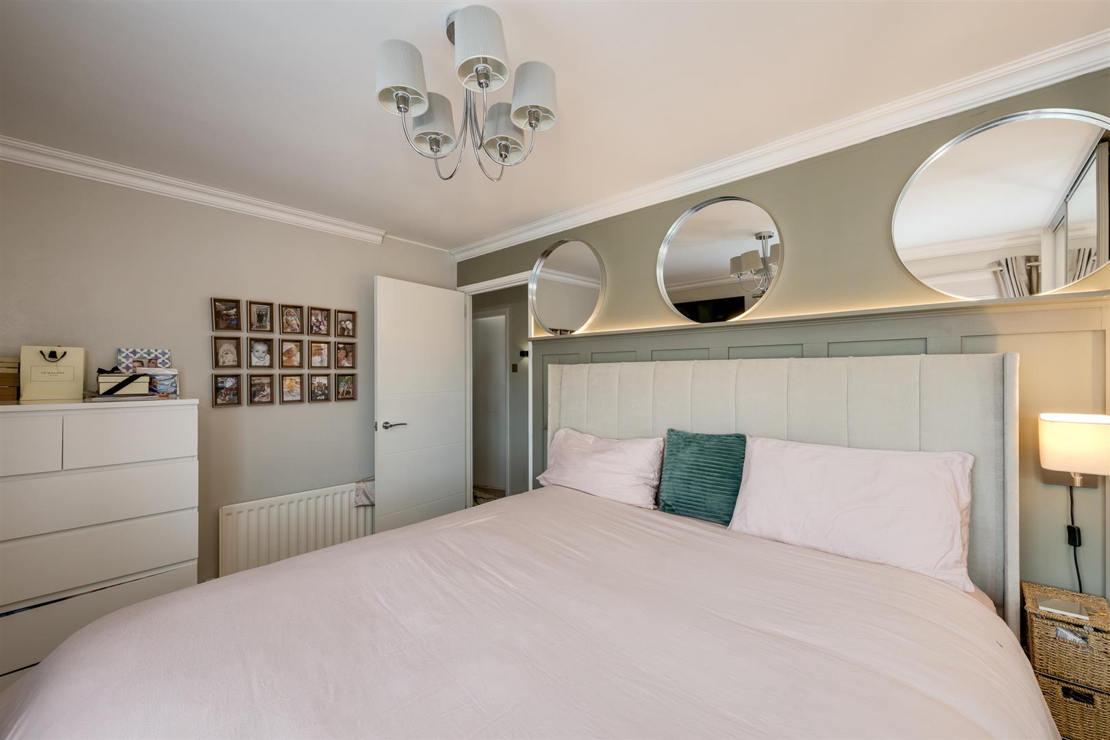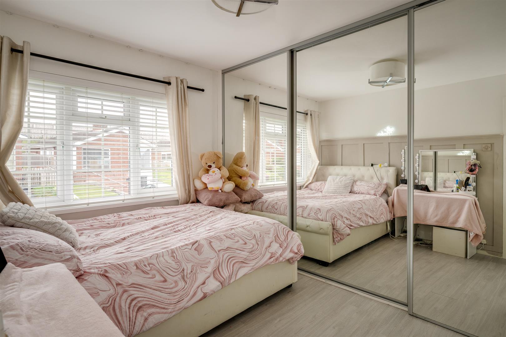 Outlook to rear, laminate wood effect floor, range of built-in robes with mirrored front.
