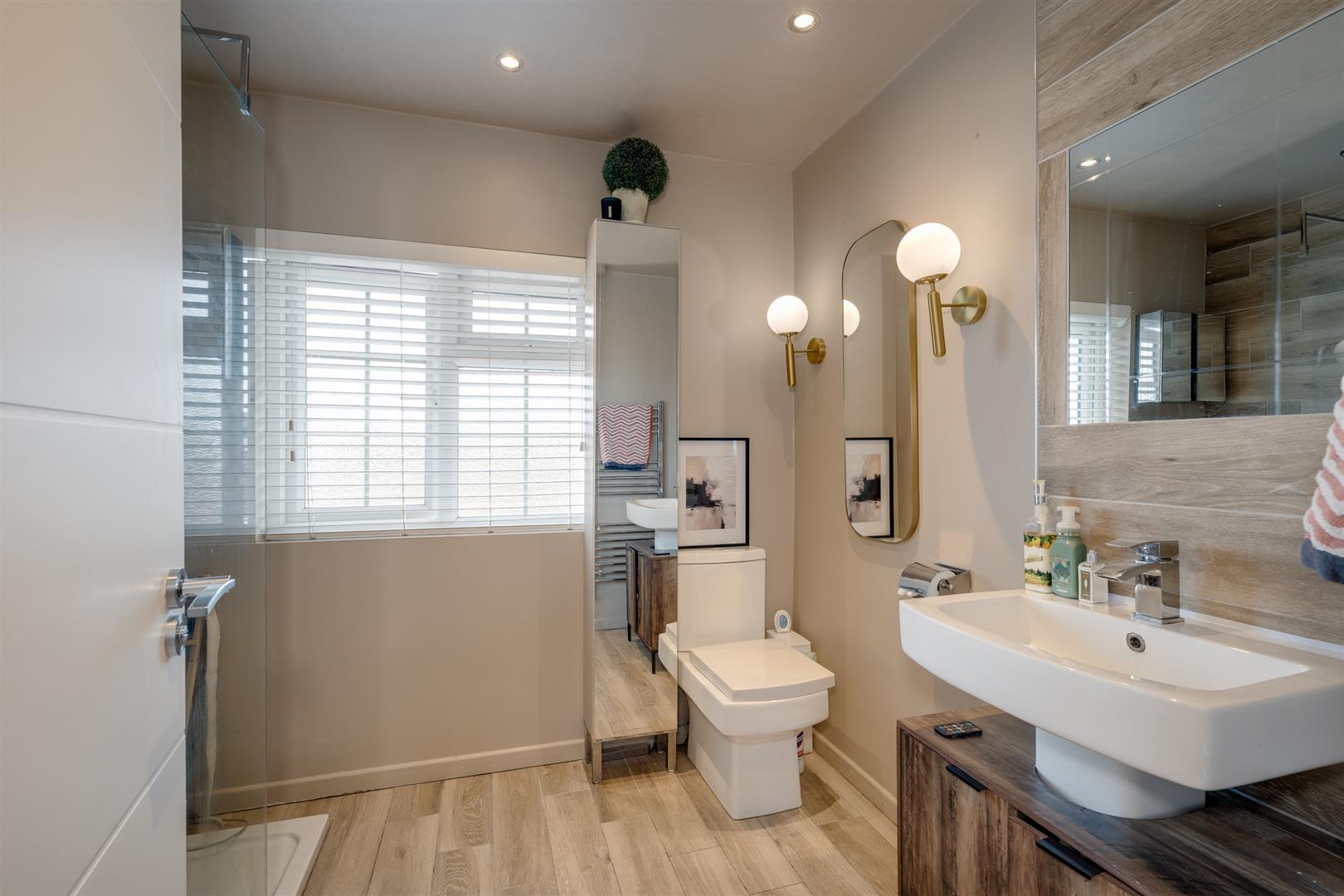 White suite comprising of low flush WC, wall hung wash hand basin, chrome mixer tap, vanity storage below, walk-in thermostatically controlled shower, telephone handle attachment, drencher above, tiled wood effect walls and floor, power shower, tiled walls, chrome heated towel rail, glazed shower screen, extractor fan, inset spotlights.