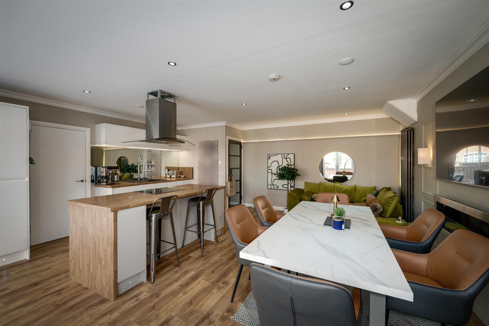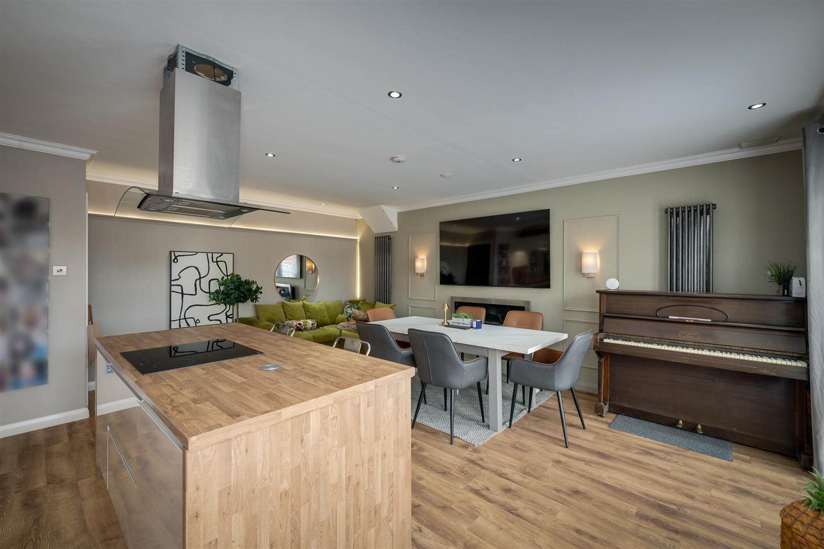 With feature panelling to walls, cornice bordering, inset spotlights, built in ceiling Bluetooth speakers, under cabinet sensor lighting, modern fully fitted kitchen with range of high and low level units, sink with drainer, chrome mixer tap with pull out shower/hose, mirrored splashback, integrated dishwasher, integrated oven, integrated microwave, integrated fridge, integrated freezer, island unit with laminate wood effect work surface, four ring hob, stainless steel and glazed extractor fan above, pop up USB charging port and power socket unit, laminate wood effect floor, LED sensor lighting detailing to kickboard, outlook to rear, uPVC and double glazed access doors to rear.