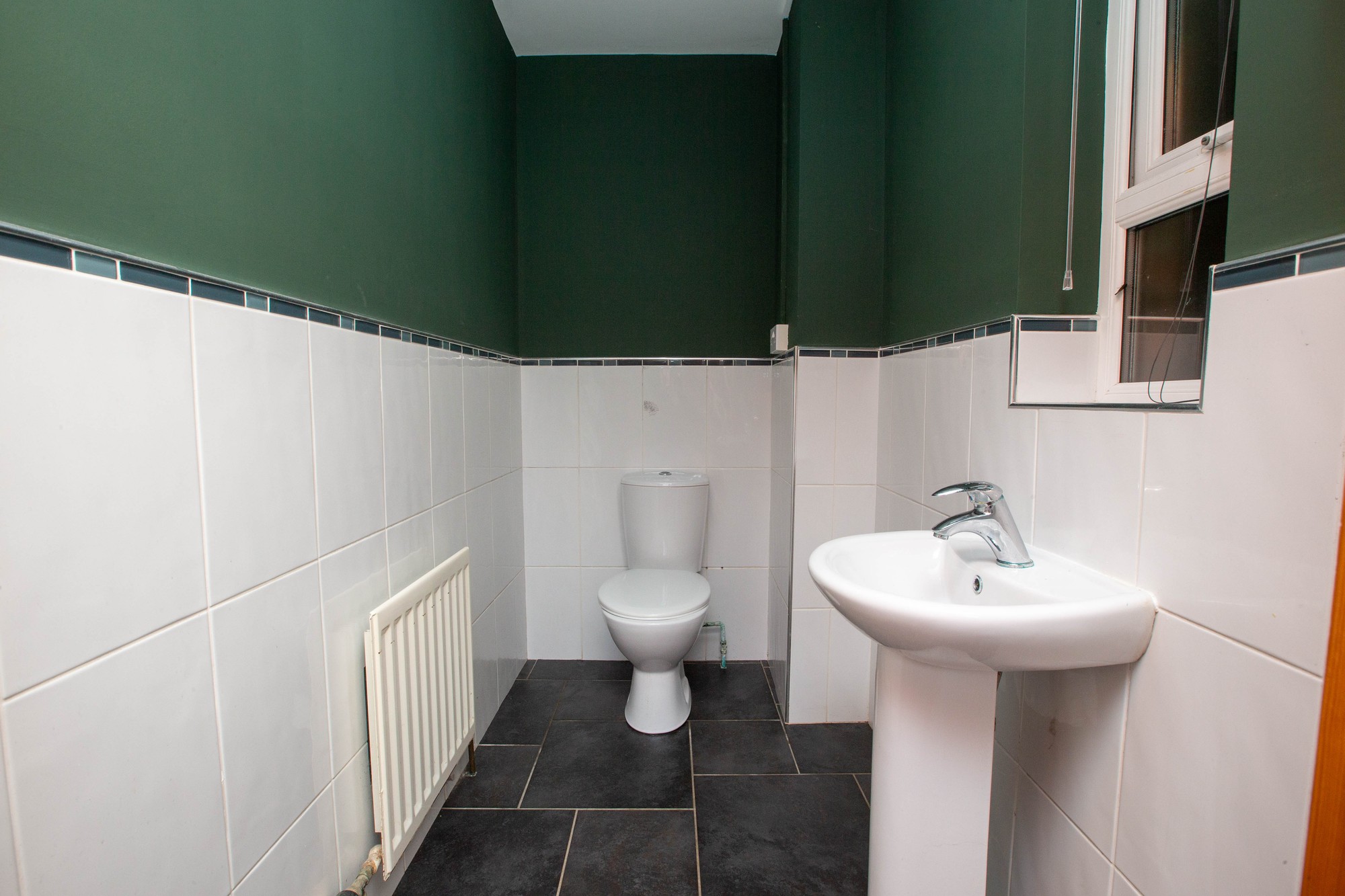 CLOAKROOM Wash hand basin and wc, part tiled walls, tiled floor.