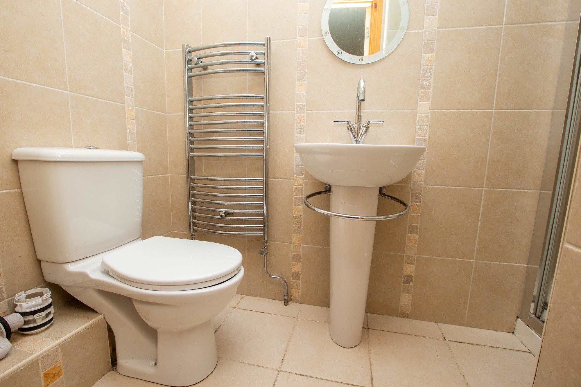 Shower Room En-suite Shower cubicle with electric unit, wash hand basin and wc, chrome towel heater, tiled walls and floor.